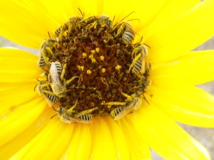 If you drive from Portland, through the Columbia River Gorge, towards Idaho or Wyoming, you will see tons of sunflowers guiding you along the highways. Native sunflowers, some consider weeds now, almost pull you over the Rockies towards the prairies of North America. That is one way to look at it, as I choose to do so. I guess that others pragmatically see the seeds of these flowers getting stuck in the wheels of our vehicles, being flicked hither and thither as we drive about the place. Regardless of all of this, at least there is this caveat. It appears as though these blooms offer a soft resting place for the bees that we need so much. And if you are worried about these little guys in the image, we touched one, just to be sure, and it was alive. They were all in a very deep, deep sleep.
