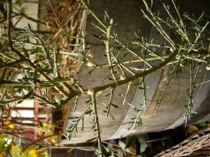 This plant is one of my current favorites. Though its official name is Melicytus angustifolius, it has no common name, yet! Purchased at Cistus here in the Portland area, it was something my husband chose due to its unusual appearance. (How else can a woman take her husband plant shopping?) I would love for it to have a common name other than: That-Plant-My-Husband-Picked-Out. Since Snowberry is already taken, I may want to call it Winter Pearl Shrub. No matter. I just adore it and cannot wait for it to grow more. (I am picking a few berries for seed. Hope to grow more of these.)by