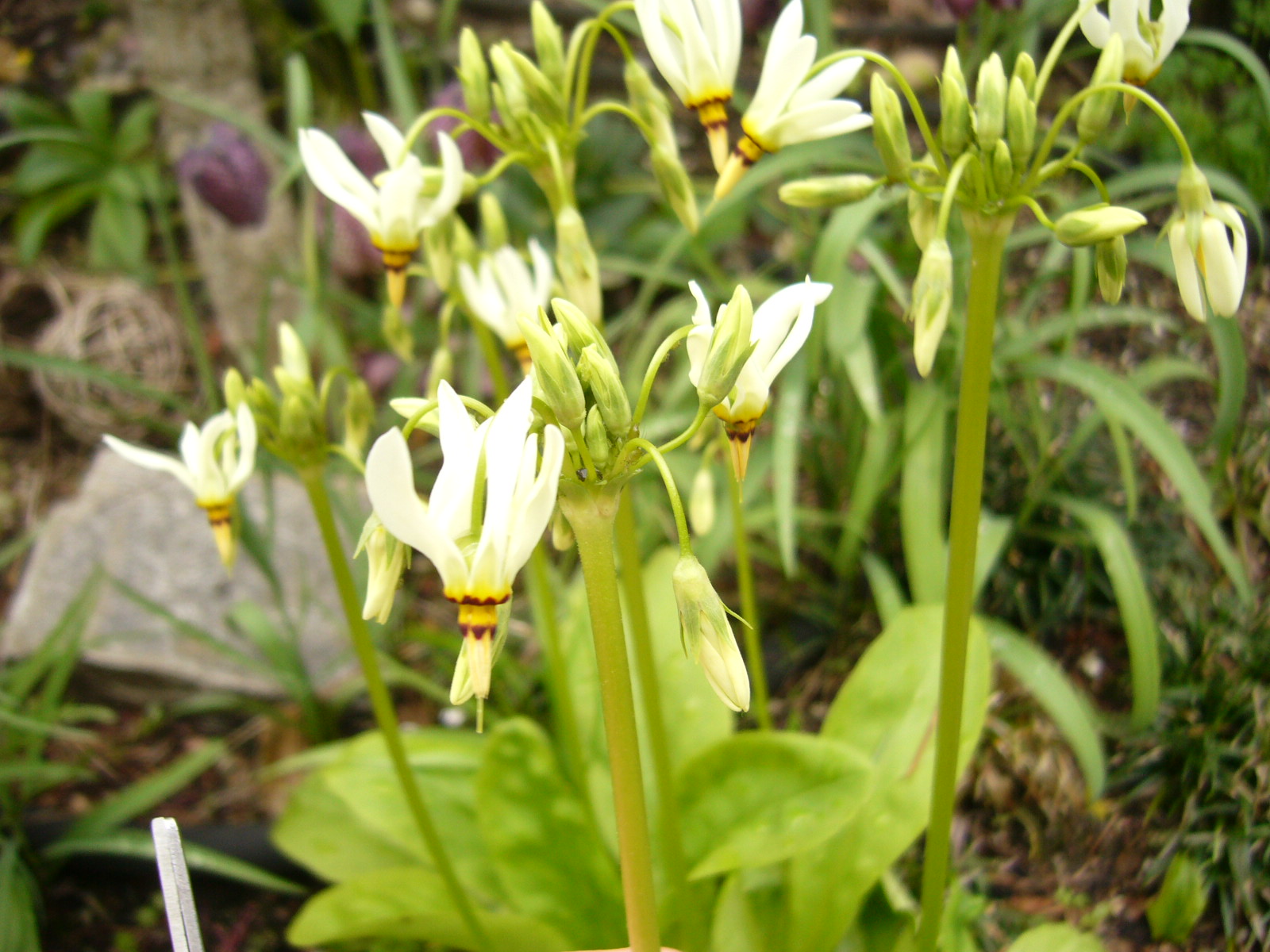 Seen here is the amazing white version of the North American native perennial Dodecatheon meadia. These little delicate blossoms are so beautiful they’ve inspired many colorful and creative names over the years but its most popular common name is simply “Shooting Star”. Other common names include: American Cowslip (since it is a relative of the primrose), Indian Chief, Rooster Heads and Pink Flamingo Plant. Since the plants grow east of the Rocky Mountains—in virtually every state—I’m sure that I’m missing a name or two. (Let me know if you know any more…)