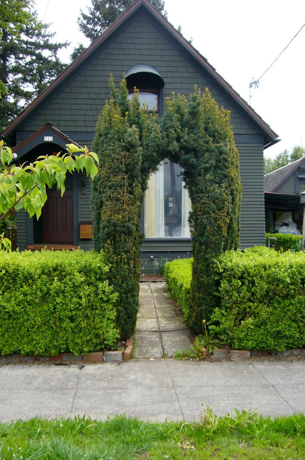 This little archway has amazed me for years. I first noticed it when we moved to the neighborhood almost 6 years ago. Again, this is a yew, but this time the front of the building is facing west so it gets more sun than the dealership. I have yews in my garden, and it is likely that I will do this with my narrow yews someday, but it will have to be added to that long list of things to do. Lucky for me they are still large enough for me to move with ease, and I’m young-ish. Yews do grow slowly.