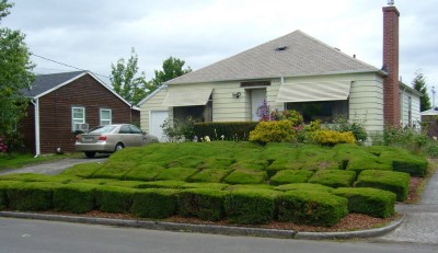 Lastly, there is this yard. It too is in the neighborhood and is down the block from the last one. Why would you do this, right!?! This has to be one of the lowest maintenance looks I have ever seen, except those trims probably take awhile. The shrubs are never allowed to grow together and are trimmed so that there is always space between the bushes. At least it’s drought tolerant.