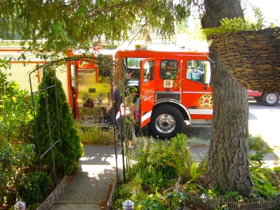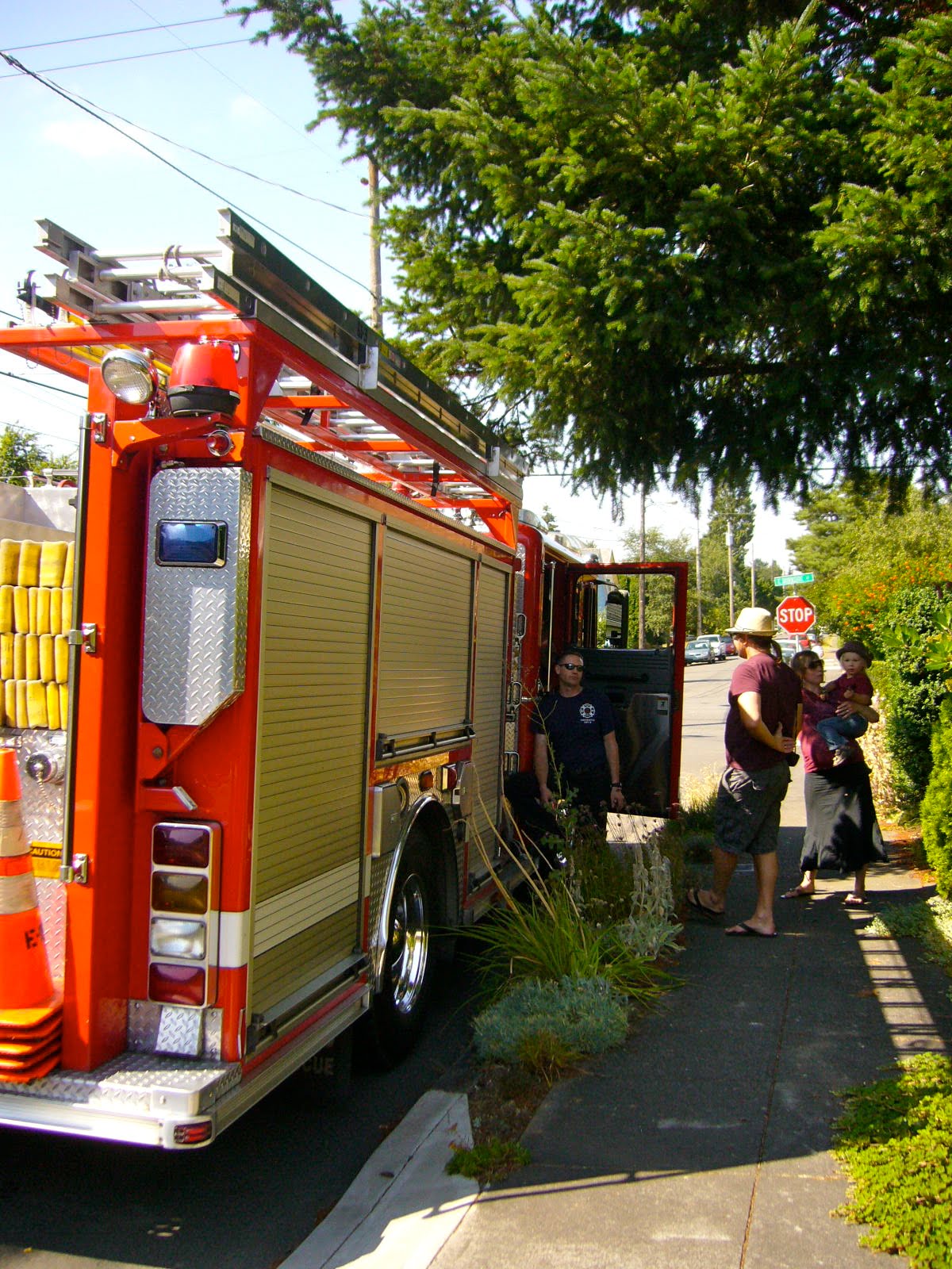 So who knew that you could invite the fire station around the corner and they’d ride a truck on over for the kids? I had no idea, but a neighbor knew, and she invited them. We were not disappointed, especially when it parked in front of our house! (Red really does go with green doesn’t it?)