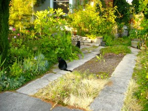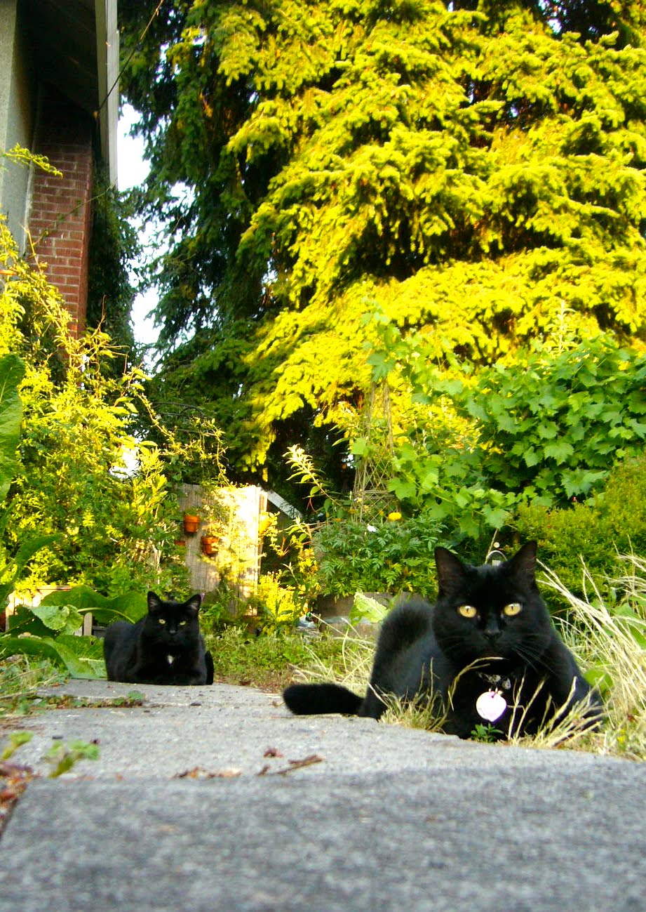 Also, later on in the evening, the two most daring cats crawled out to stake their claim to our feline friendly pad. This was quite shocking seeing as there were several large dogs off leash roaming around directly across from them. Out in front is my old lady, Macavity, and Meng, the neighbor cat with two homes, is in the back. They made me so proud.