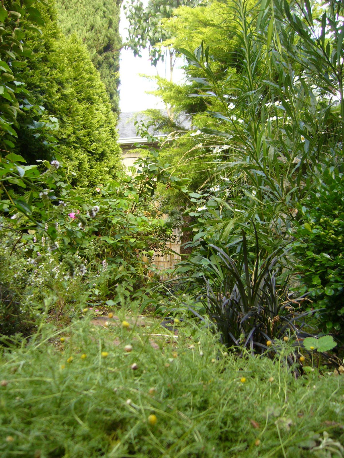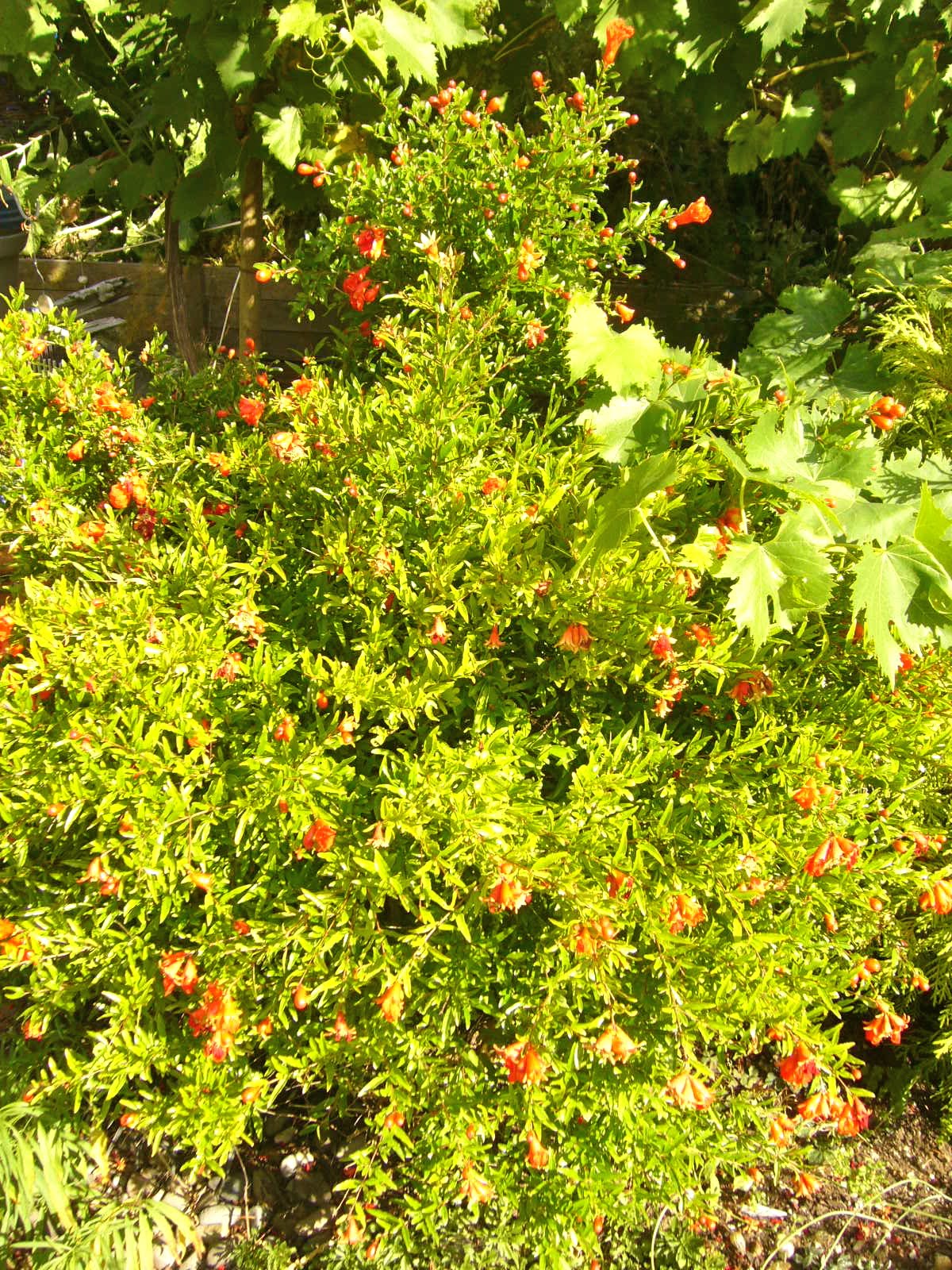 Here is the pomegranate in context. It is to the bottom left in the corner of this picture. The grapes are escaping their supports in this picture and are about to reach out to strangle their neighbors. (These are Italian wine grapes. I planted them to remind me of all the hard work my husband does making wine down in California.)