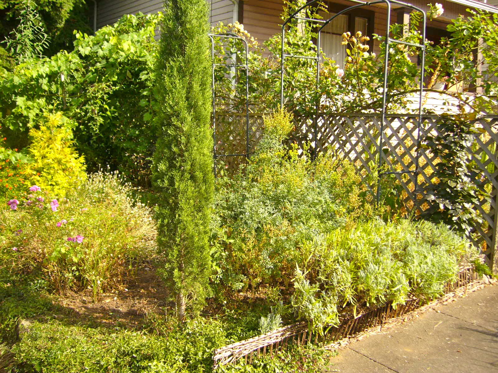 Here is the cleaned up front area. In my mind, it is the least attractive area in our garden. I think it is due to the heat during the summer. The Provence lavender was finally harvested at least for crafts and gifts. It had eaten the sidewalk and folks would walk around it to avoid it. Now I will be able to watch more neighbors walk by since they won’t avoid our side of the street anymore.