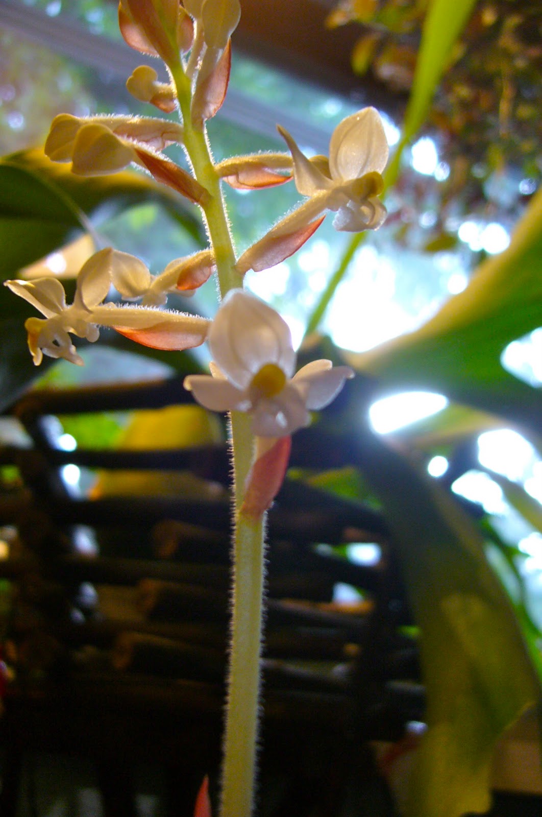 This is our very first bloom on our Black Jewel Orchid. When the plant grows larger, there will be many more of these spikes. I hope that it will add more than one spike per year though. They bloom during winter so I guess no matter what I should not complain right now. It really is beautiful to look at when it is so cold outside.