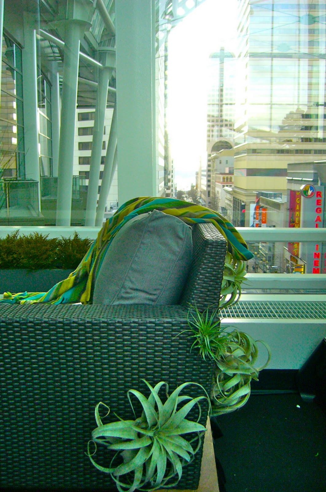 | Air plants on furniture—with Puget Sound out in the distance and Pike St Market. |