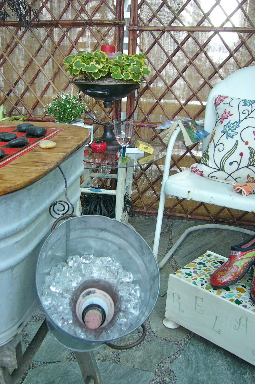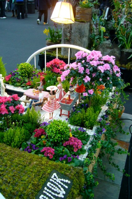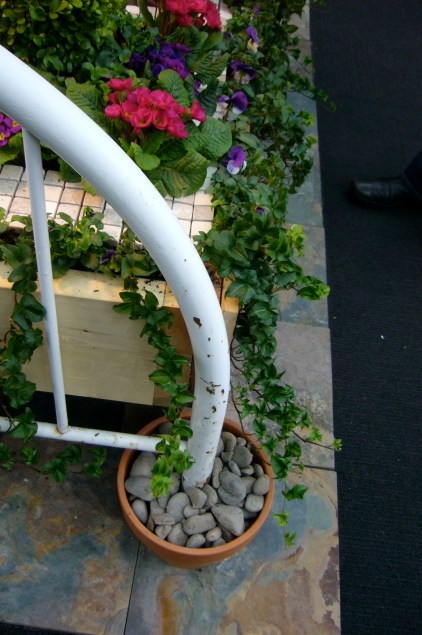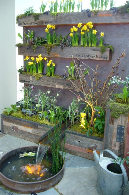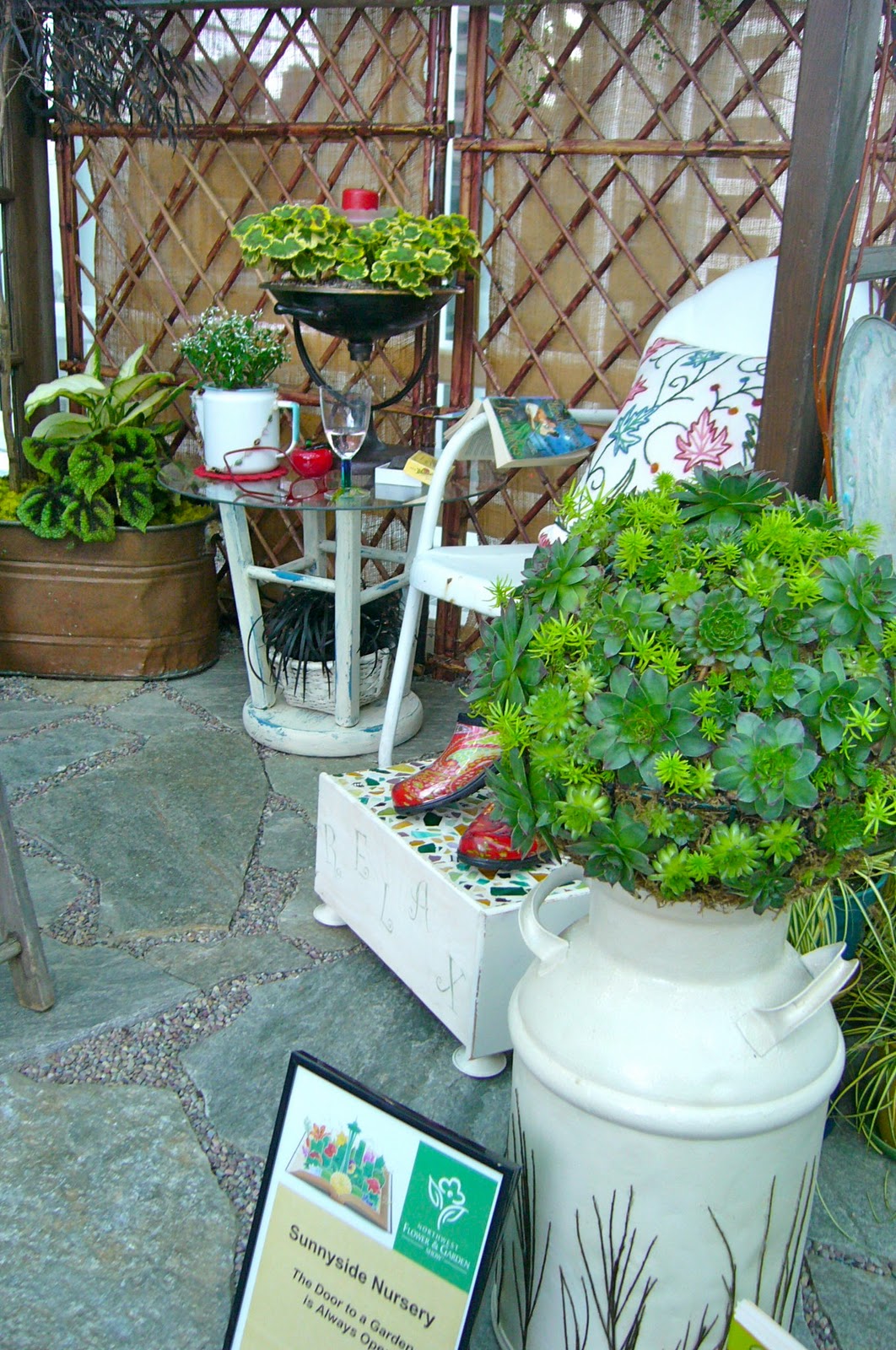 | Two of the container garden displays had beverages on display too for the gardener’s pleasure. My husband the winemaker completely agrees. |