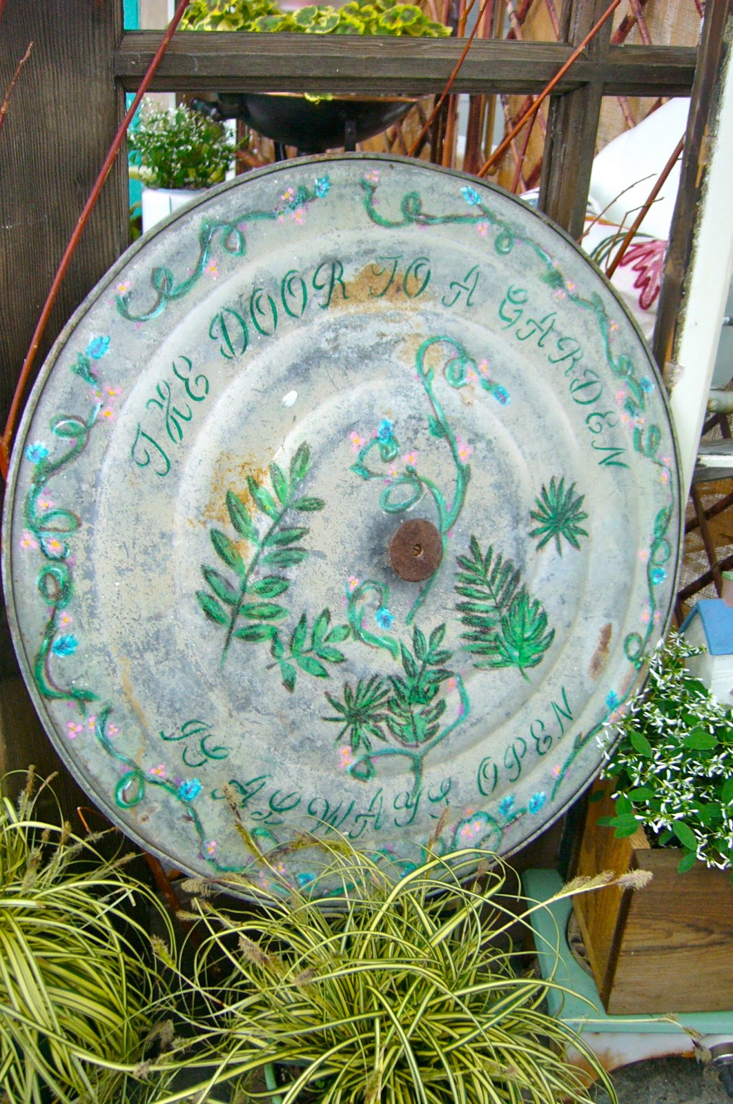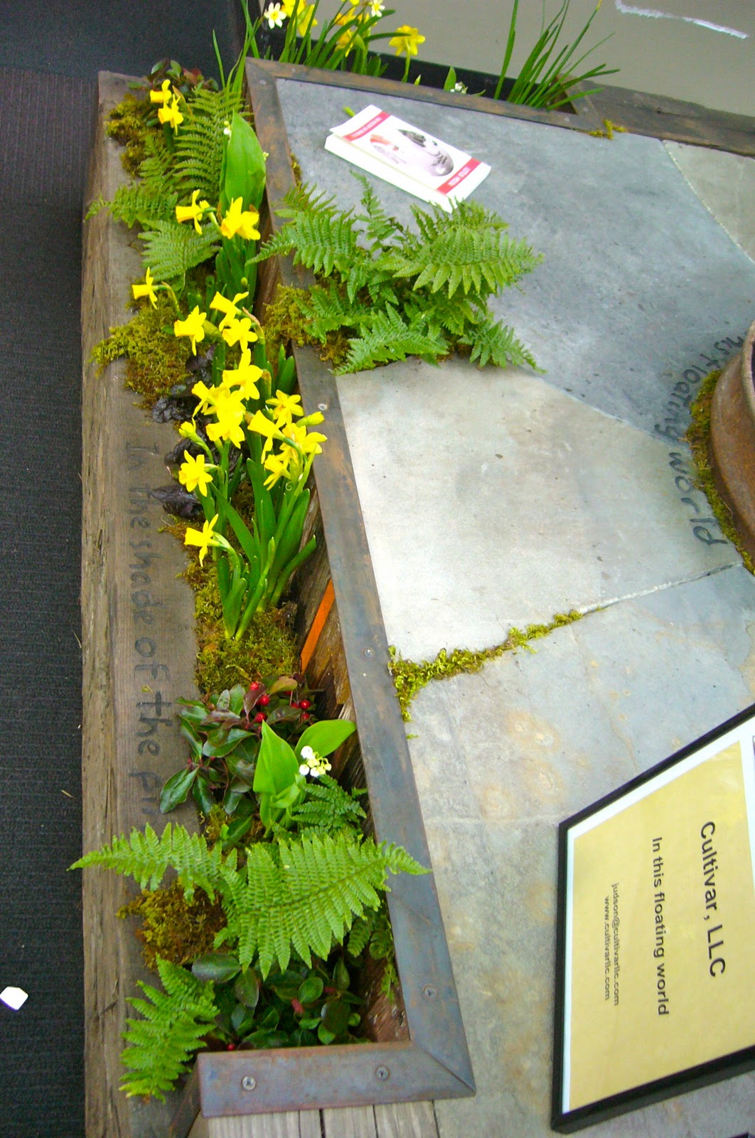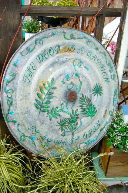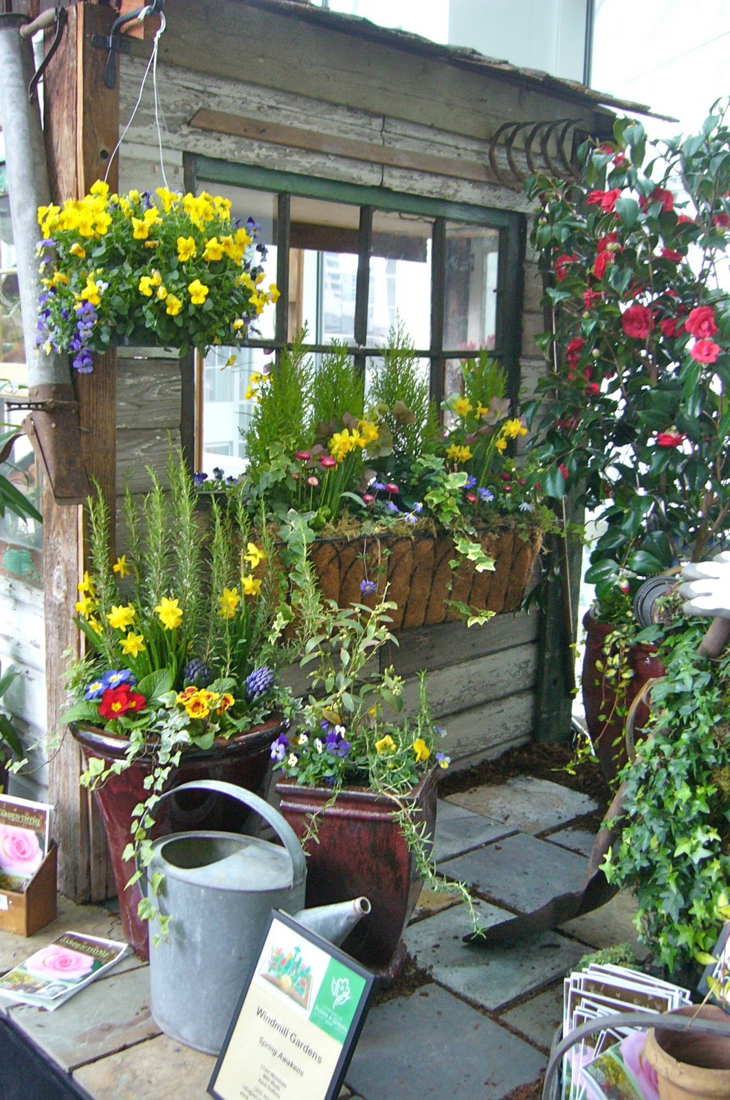 | Two of the container garden displays had beverages on display too for the gardener’s pleasure. My husband the winemaker completely agrees. |
