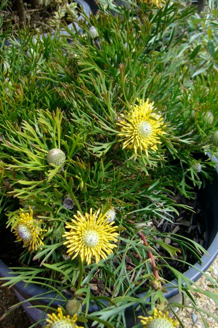 Isopogon anethifolius ‘Cura Moors’. This is an Australian Protea that’s a shrub. Hardy to 20-25°F.