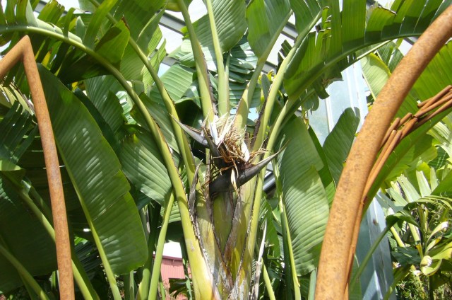 Those big banana leaves, and the white flower? Our Strelitzia nicolai. Grows HUGE!