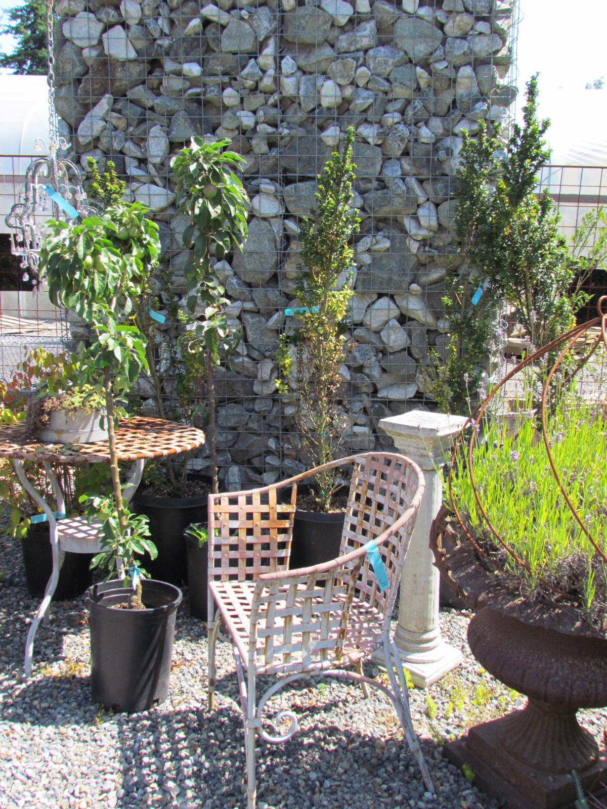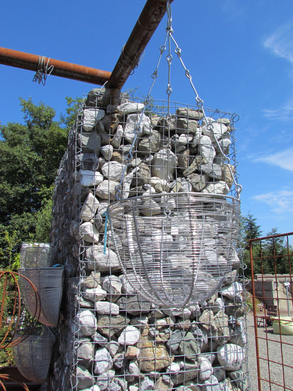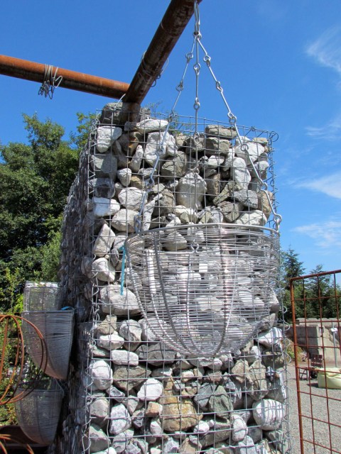 A few years ago these gabions inspired my husband to make his own at the family vineyard in California. His is much smaller but he loved that he could use rocks he’d been digging up in the vineyard to fill it up. (Note too the metal “picture” frames. They are actually recycled metal grates.)