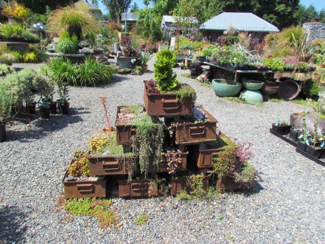 It's probably a very good thing this wonderful nursery is miles away from me and surrounded by water. Thanks for all the photos. Love the aluminum wire planters. And also your very astute comments re mediterranean influence that doesn't amount to Tuscanization.