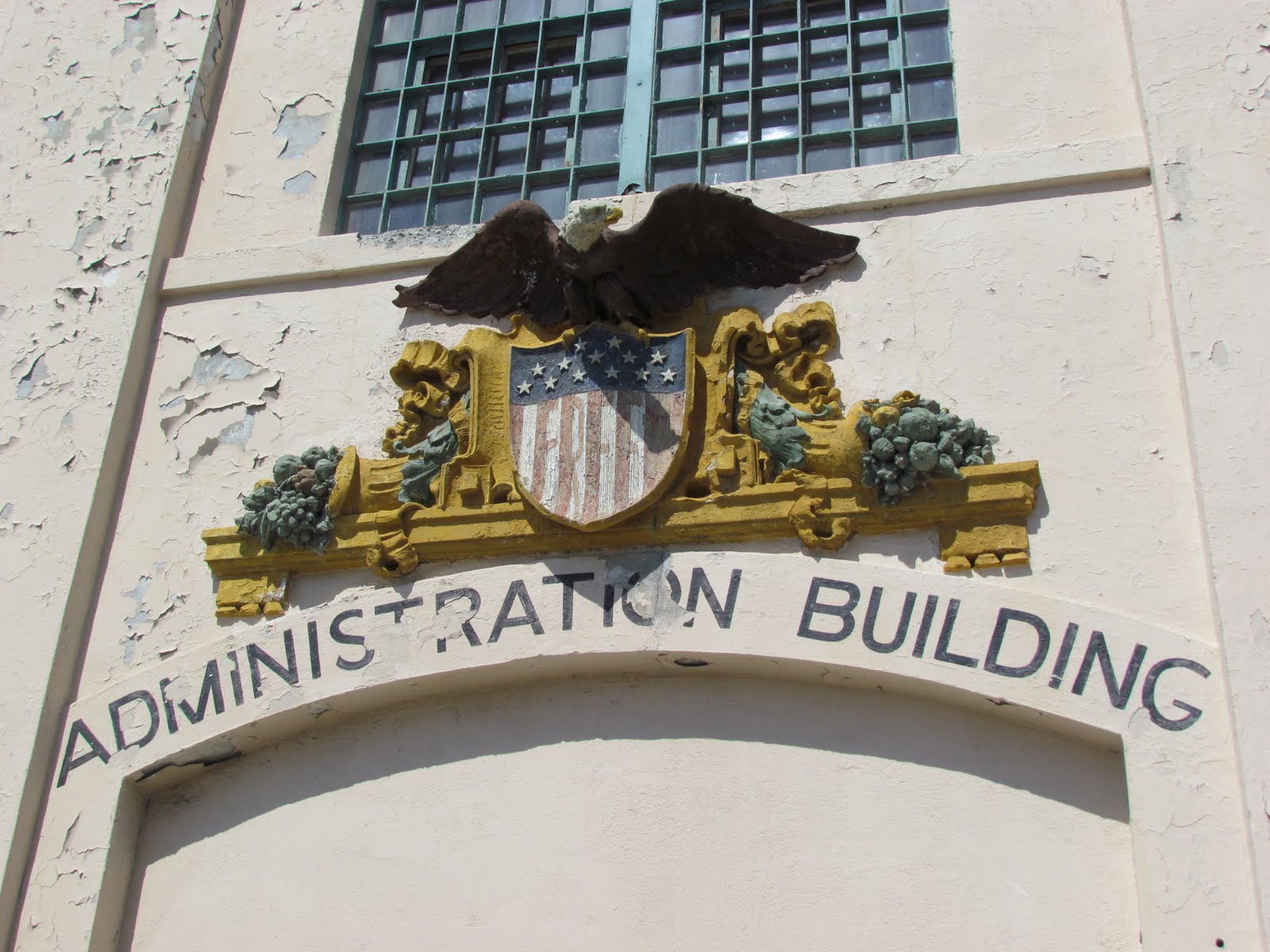 | If you were coming to visit someone on Alcatraz, you would have had to walk under this display. The cornucopias with their bountifulness is a bit odd. |