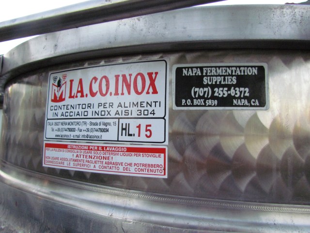 I looked at the color of the grapes, took the picture, and then as I was on the ladder I laughed when I noticed the labels on the tank.