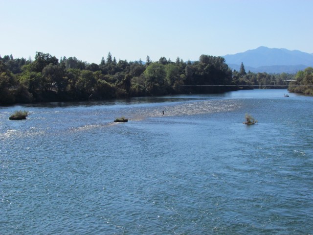 While stopping in Redding to visit McConnell Arboretum & Botanical Garden I caught some folks fishing for salmon in the Sacramento River. The flyfisherman who’d waded all the way out in the riffles was fun to watch but I was disappointed that he didn’t know how to cast. (Sometime I will have my husband take a picture of me casting. It’s the only fishing skill I retained from my upbringing.)