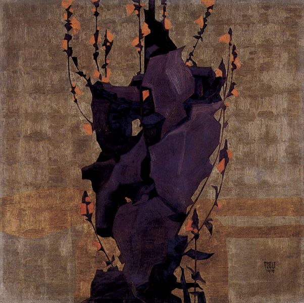 | Stilisierte Blumen vor dekorativem Hintergrund, Stilleben, 1908 (Stylized flowers before decorative background, still life) by Egon Schiele |