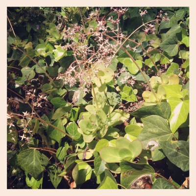I’m not sure which succulent this is growing in the English ivy but it looked nice in bloom.