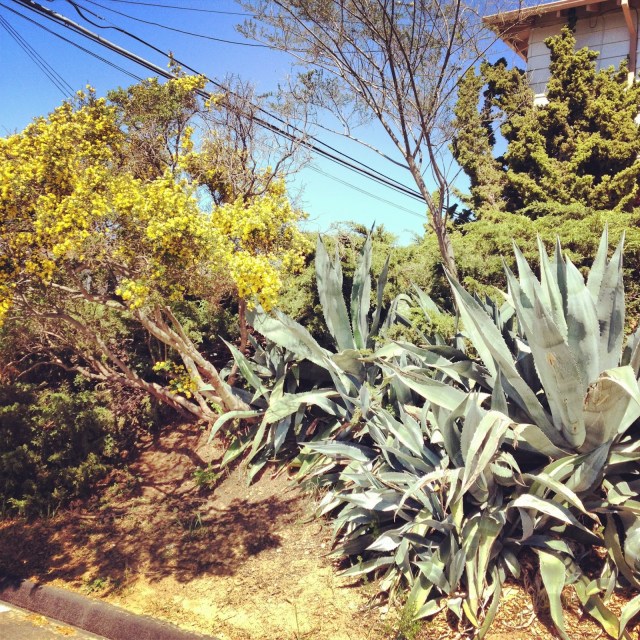 I think the yellow bloom is an Acacia, but let me know if you can ID it. Its companions are some lovely Agave americana or century plants.