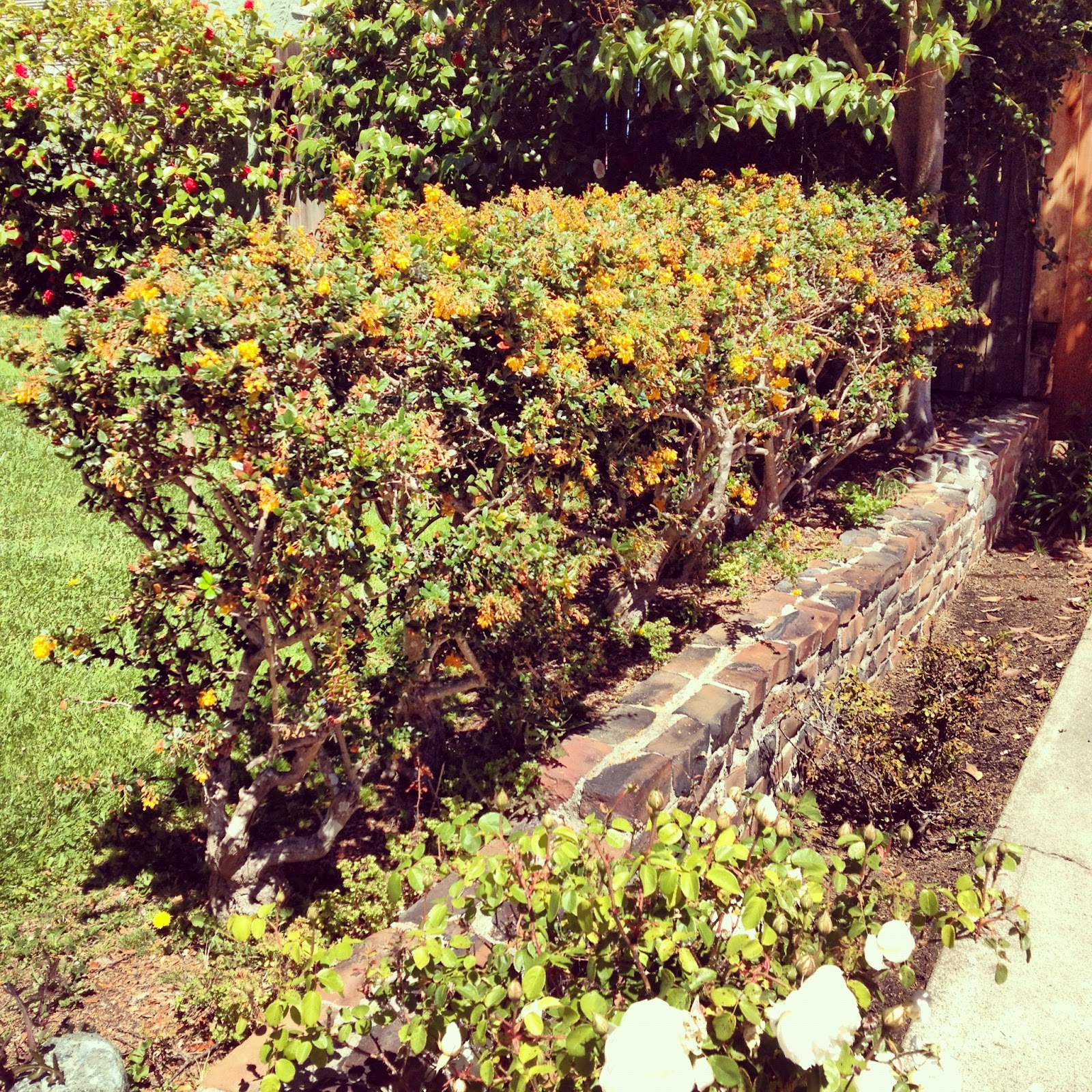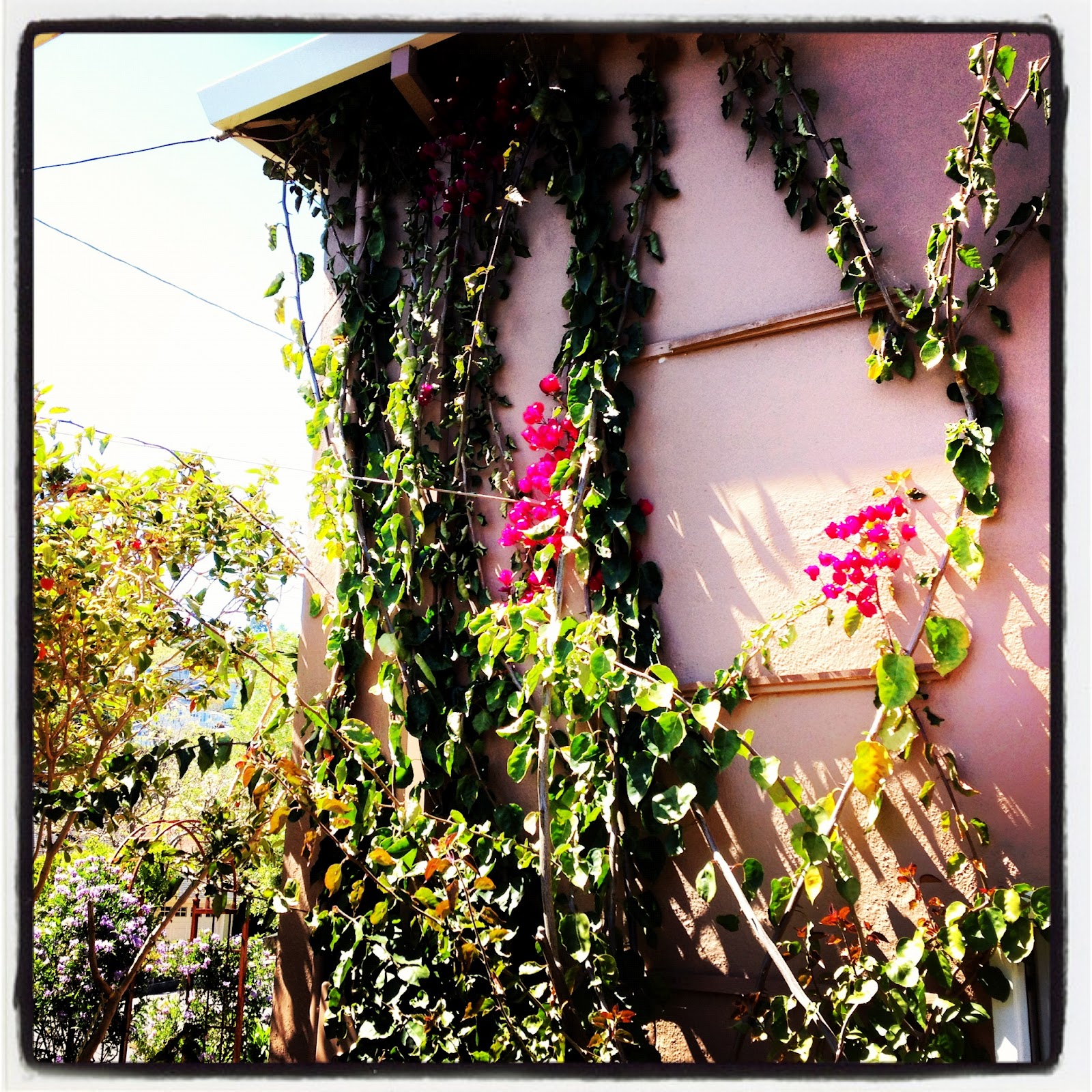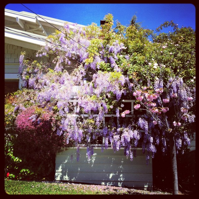 This house really screams of springtime (left to right): Leptospermum, Wisteria, Blooming Cherry (Prunus) and a pink climbing rose (Rosa).