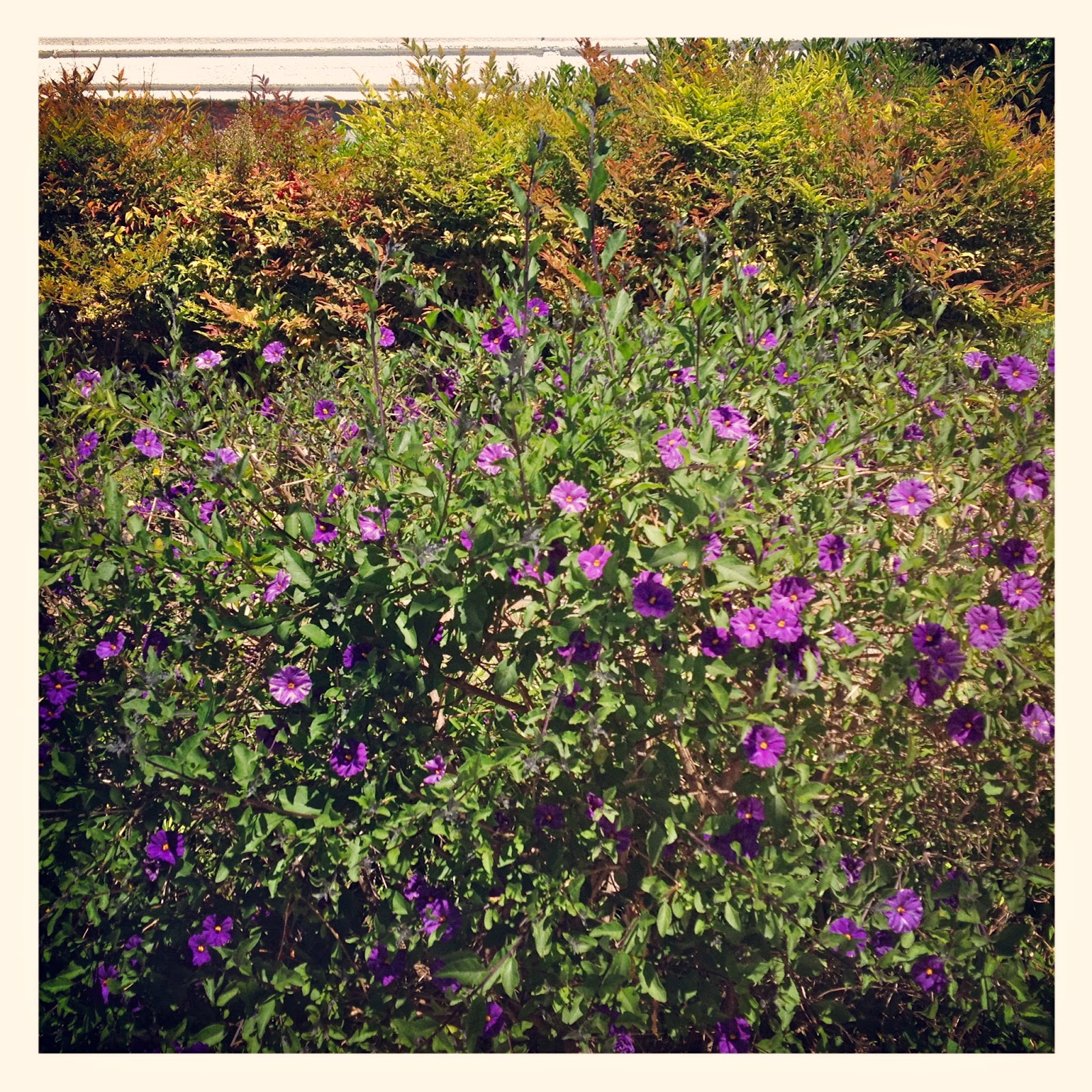 I think this is a kangaroo apple hedge but I am not sure—Solanum laciniatum. Thoughts? (I mean other than, “Wow, that’s in the deadly nightshade family and it’s a hedge!)