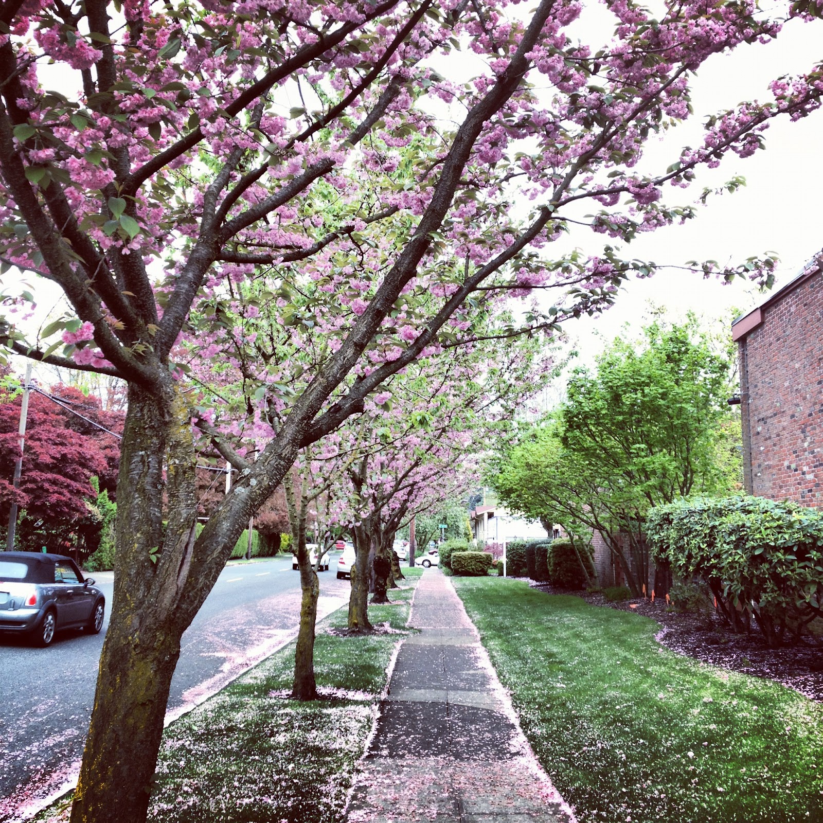 Seeing the cherry blossom petals scattered on the sidewalk while standing amongst them has made me smile with pleasure this year. They won’t be here for long and this year I won’t have to see them solely from the car as I fly past them. I savored them the other night because they’ll be gone next week.
