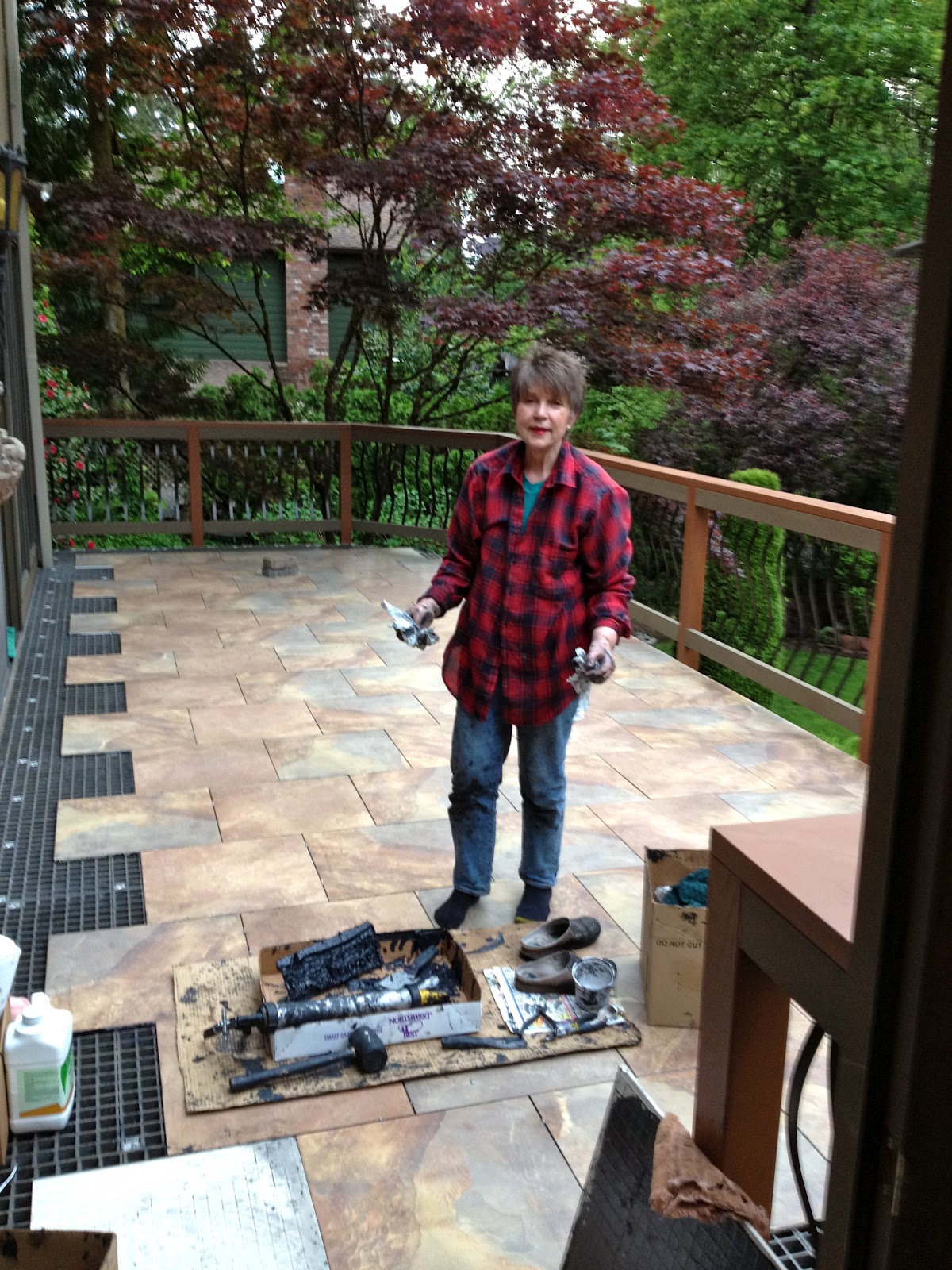 | Mom the Estate Gardener working hard to finish her latest project—a tile deck. If interested in how she did it check out: http://www.gratedex.com/ |