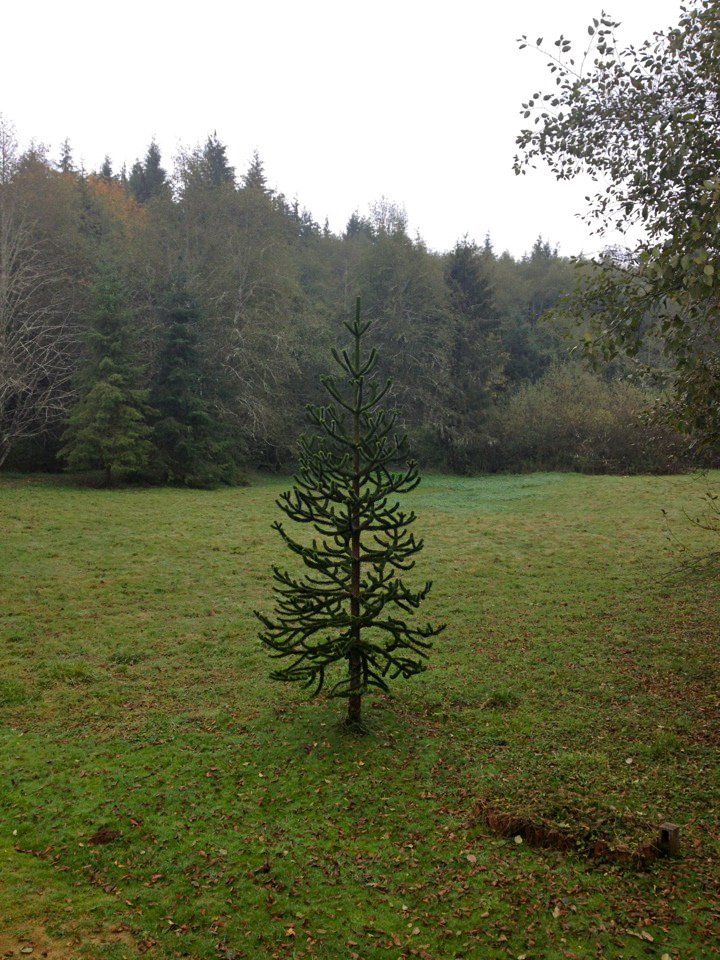 This past weekend I went to my father’s house just north of Astoria in a small community in southwestern Washington. I awoke to the sounds of chainsaws in the hills and when I walked into the kitchen each morning to make my morning coffee, I’d stand at the window and contemplate the Monkey Puzzle Tree while my coffee brewed.