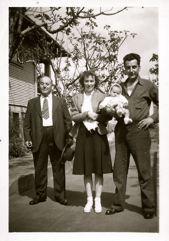 | My Sicilian great-grandfather Frank Amato, my Grandma Virginia, my father as a baby, my Grandpa Sam. (Looks to me like someone might have been working in his garden that day. |
