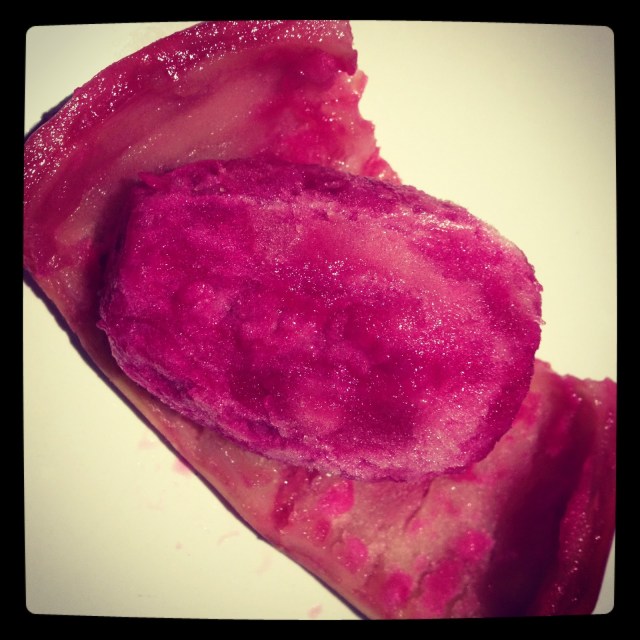 First off, that’s not Pepto-Bismol pink. This is no shy fruit color. It will stain you and stain you well. It’s Barbie pink, hot pink, not understated pink, and it’s loud and proud.