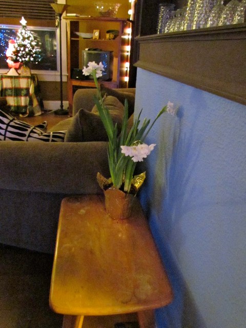 Luckily a friend gave me some forced Daffodil bulbs just before he went home to Scandinavia for the holidays. Normally I would have had a huge floral arrangement but times are tough and I was working solo on the annual Christmas Eve dinner so this worked out well. It was perfect and so much better than nothing. (It smells great too even if it makes me sneeze. Yes, those of us with allergies must choose our battles.)
