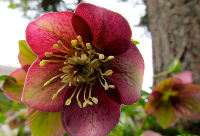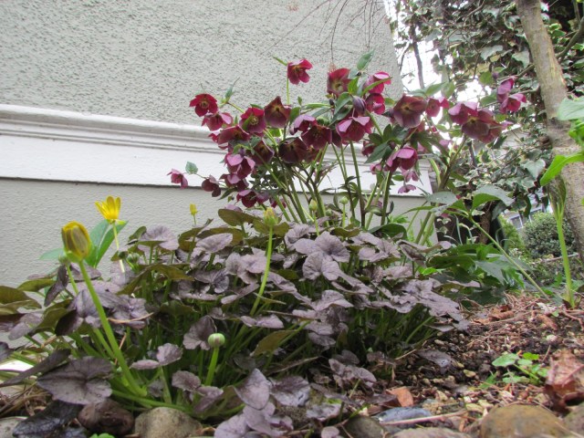 | Helleborus with Ranunculus ‘Brazen Hussy’. |