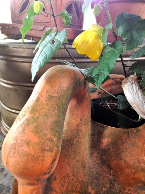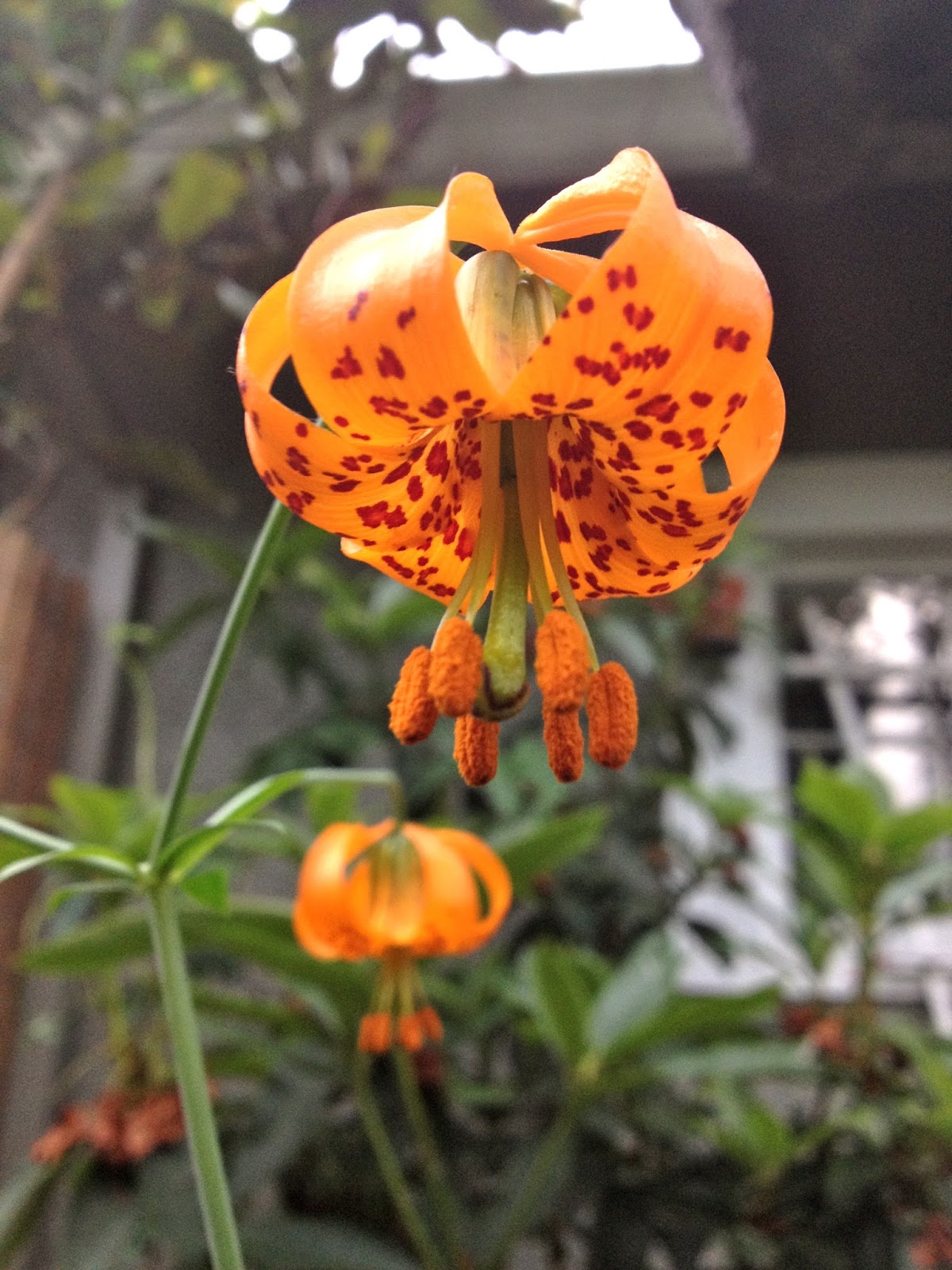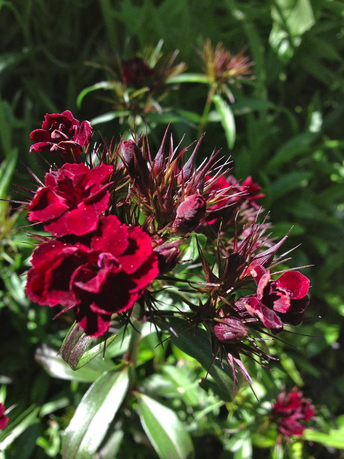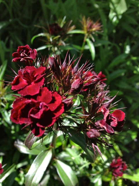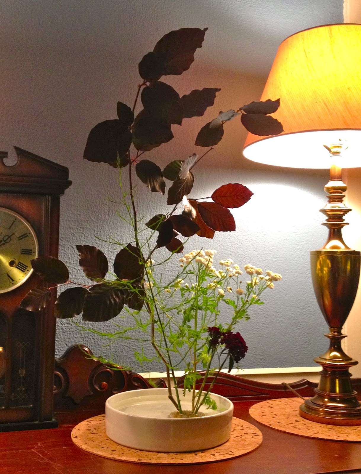 | Father’s Day Dinner ikebana with Beech, Asparagus, Feverfew, and Dianthus. |