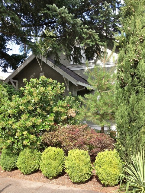 I like the small northern strip. I don’t like having to look directly at my neighbor’s house, but he’s a nice man. He just isn’t as into privacy as I am. He has landscaped with English laurels (Prunus laurocerasus), Japanese privet (Ligustrum japonicum), and cedar (Cedrus)—all having grown randomly on his property from seeds dropped by birds or else they were blown in on the wind. He then plucked them and rearranged them into rows. Amazing in its own way I suppose as a lesson in patience and he has loads of that virtue. He’s a great neighbor and I like to harvest from his ever-growing army of Western Sword ferns (Polystichum munitum). (My first client has also been grateful for this too.)