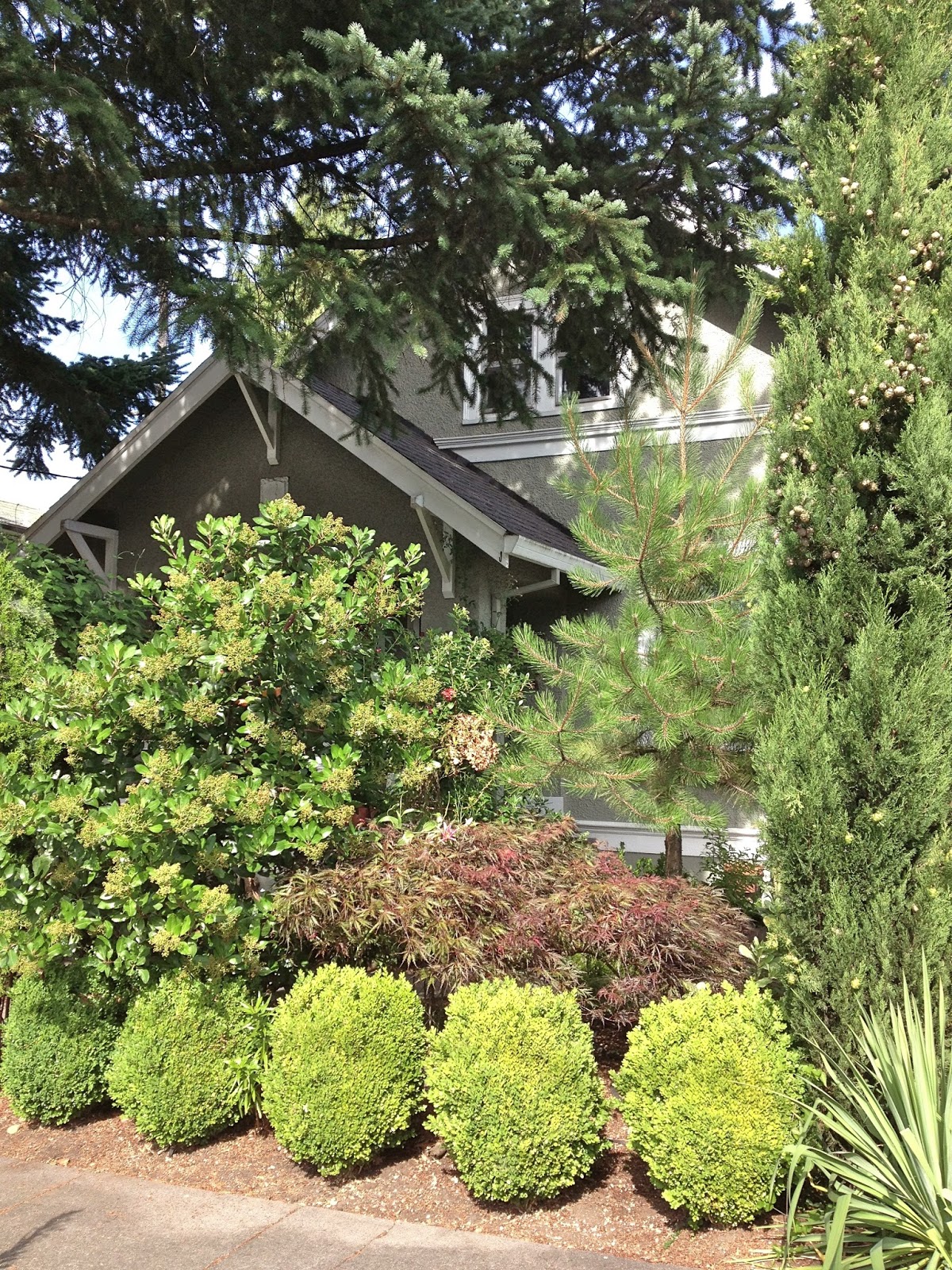 My house faces west. The front yard is not really coherent. There is the tiny hell strip, cut up into three uneven pieces. There is a central area, with a privacy planting, meant to keep the eyes of those on the sidewalk away from my large front window. The parking area is there too but it’s currently filled with racks and pots and is more of a staging area this summer. An edible garden once ran along the southern side of the house. It is overgrown now and a mass of tangled plants. It was created initially to be the domain of my ex, but I’ve not yet fully reclaimed it. I hope to soon.