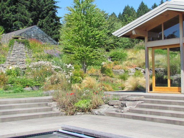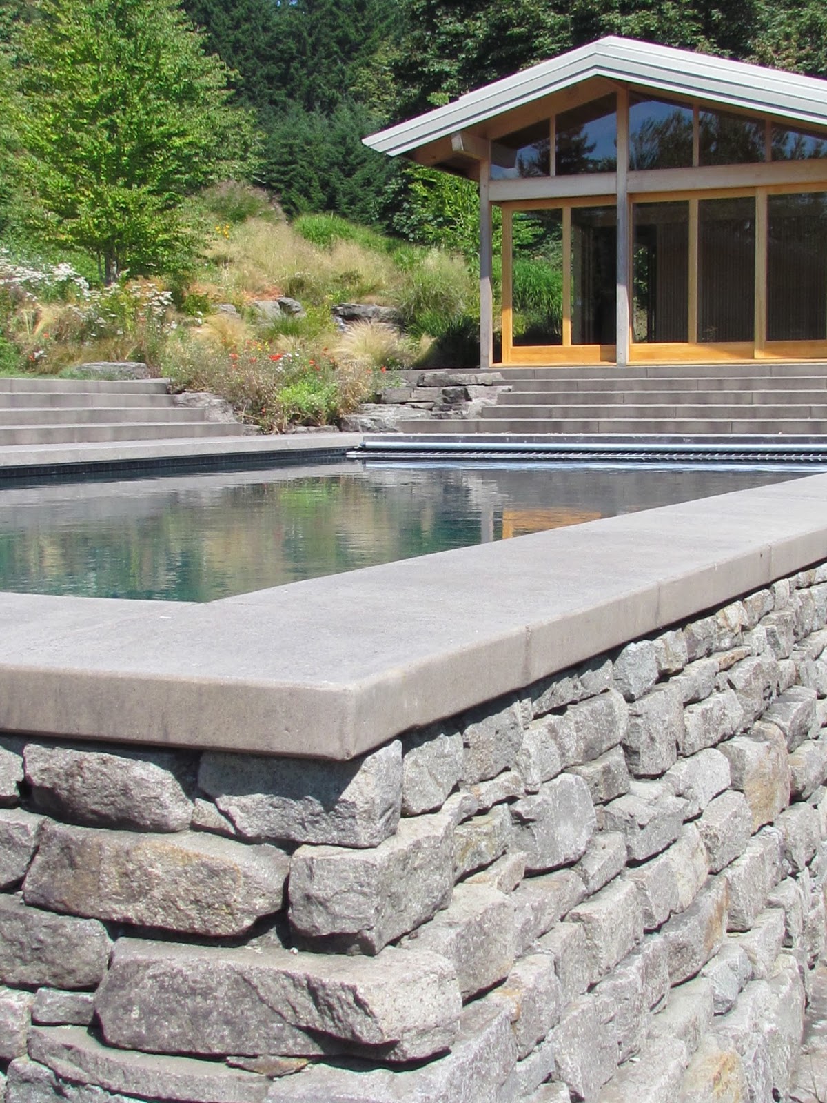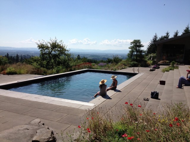 I love how the natural landscape appears to be reclaiming the steps of the pool area. What a beautiful place and a great view from the pool.