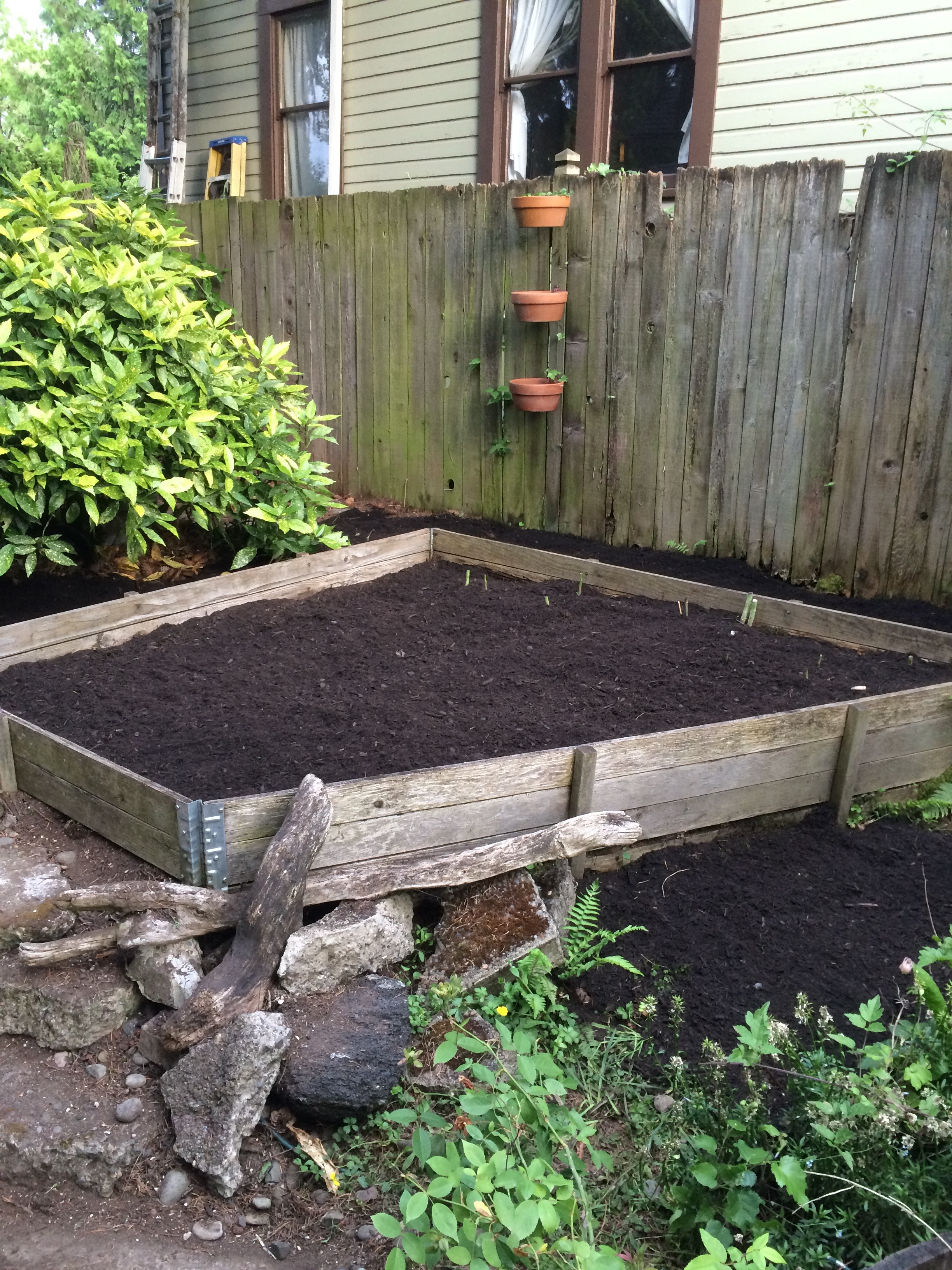 Just in time we cleaned up the front area but there is much left to do. I finally was able to move the Aucuba ‘Gold Dust’ and I hope that it’s happier beside its companion next to the fence.