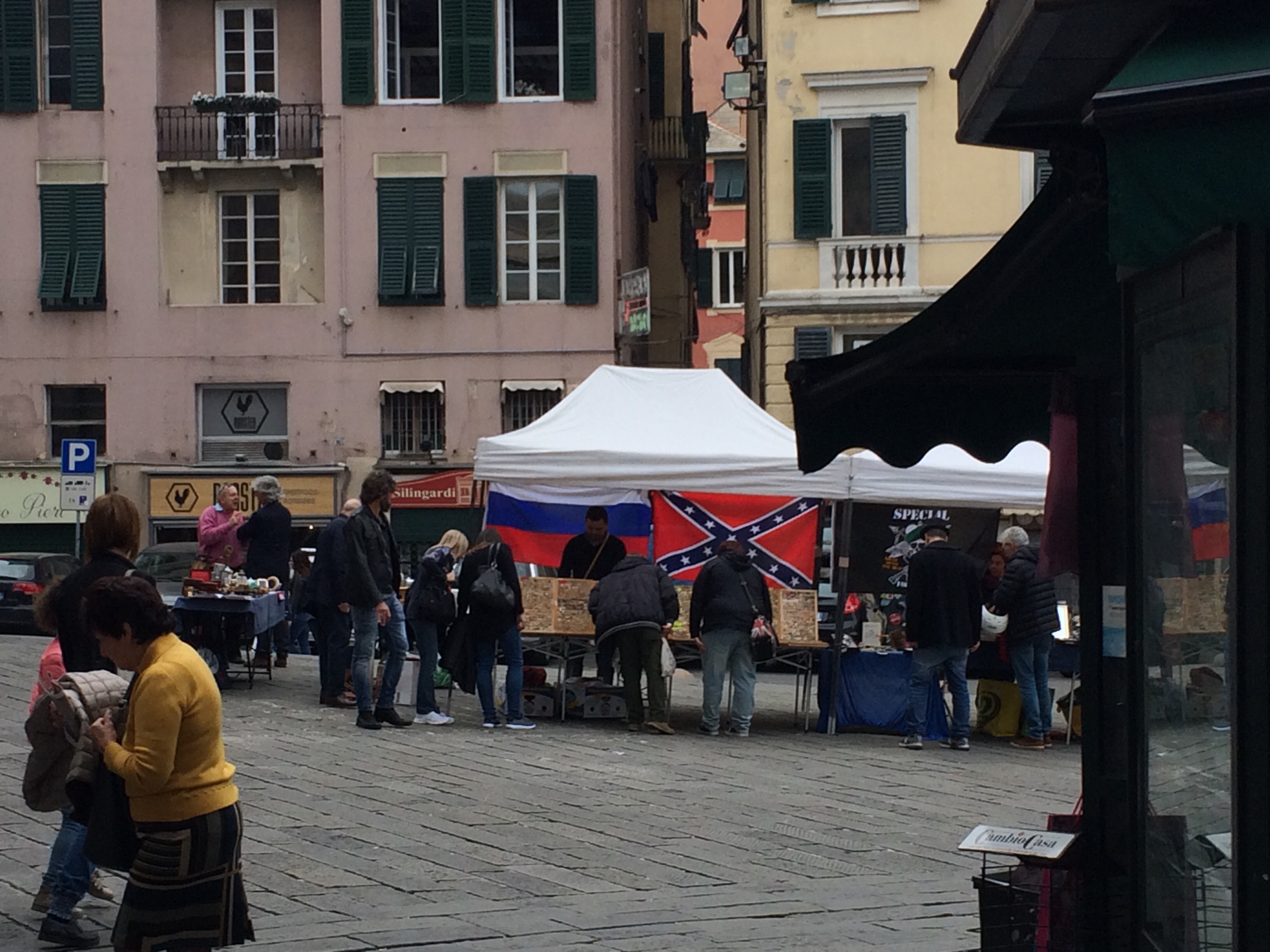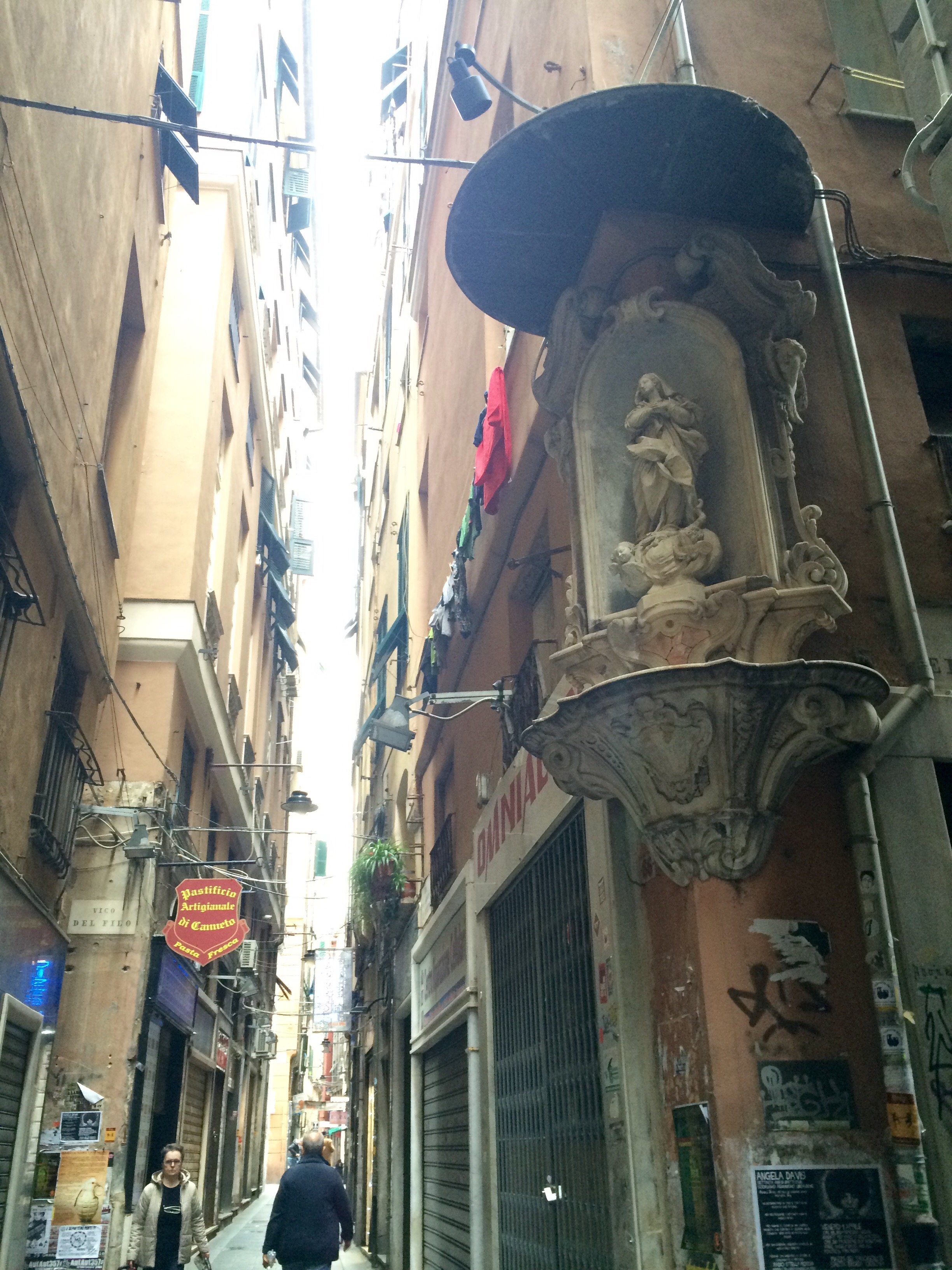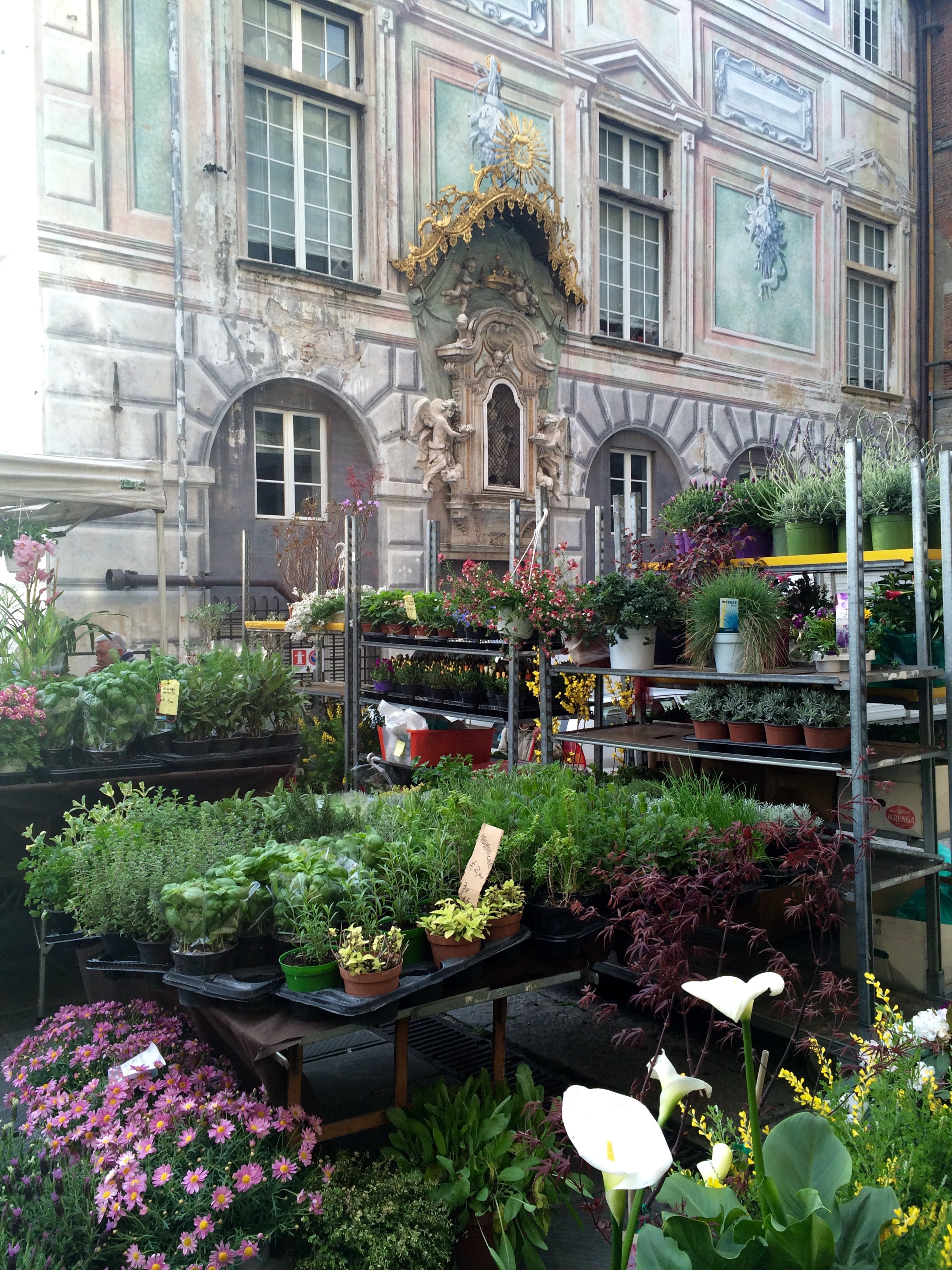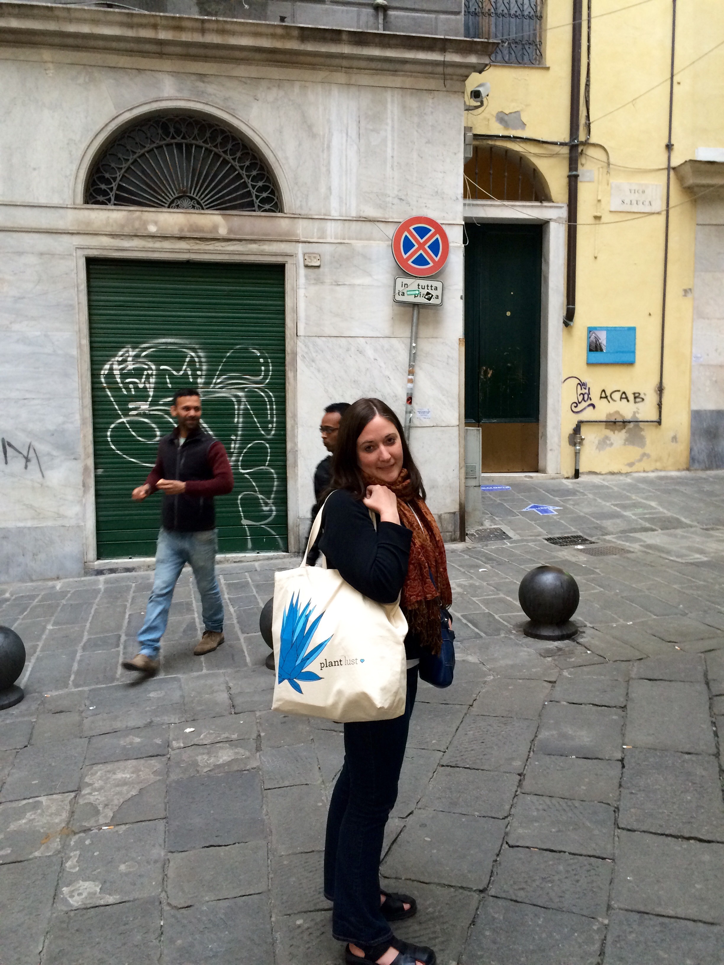 Phoenix dactylifera down by the water. Part of a botanical display in a museum in a beautiful atrium.Some churches place mirrors on the floor so that you don’t have to hurt your neck while admiring their ceilings.The historic district is known for its many narrow alleys.To say this place is a bit controversial is an understatement.Years ago guilds in the city built these niches for saints and at night they lit the alleyways. Nowadays, you might find a prank such as this one where the saint has been replaced by a cardboard witch and the A for anarchy.You never know what you’re going to find at a flea market.Homemade gnocci and pesto from our family meal. Medieval gate marking the edge of the neighborhood. My Plant Lust bag and I returning from grocery shopping.I added this to show that there is a heavy French influence here. It can be seen and heard in the local dialect as well. And before I begin my next post on the Orto Botanico di Genova, a few more plants… At the market.