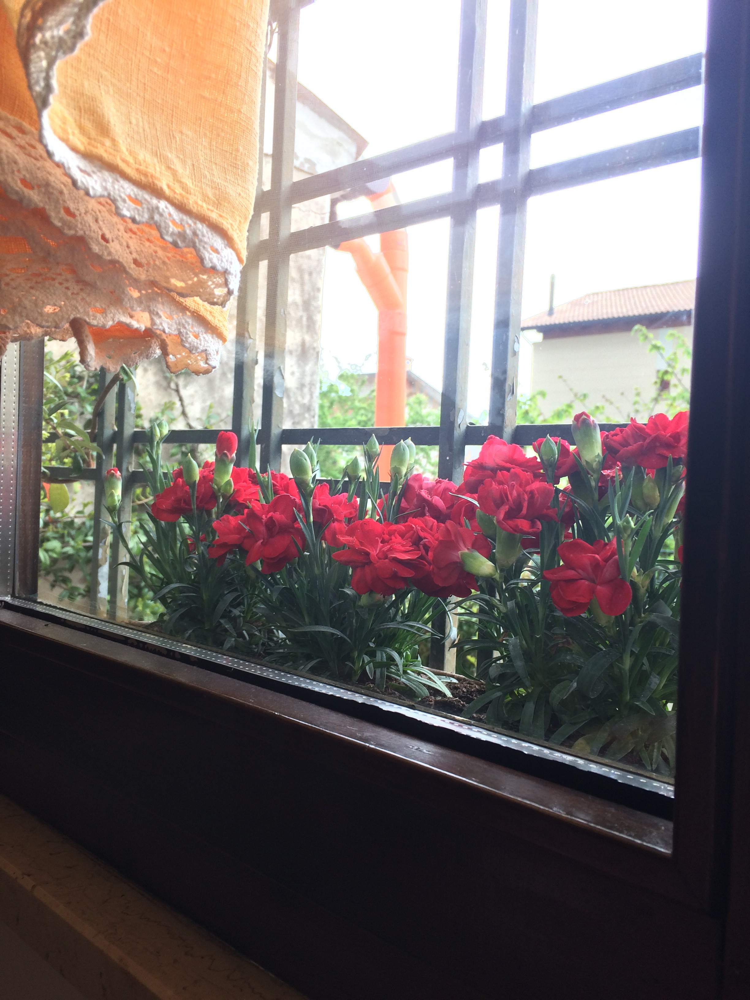 The red Dianthus, with the orange curtains, and the orange drain pipe. Ahhhhh, once again, color.