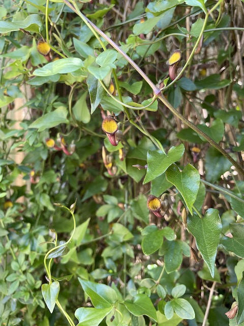 Aristolochia sempervirens on the fence and up close while in bloom this week. This plant is one of the first that I grew large batches of at Cistus Nursery.