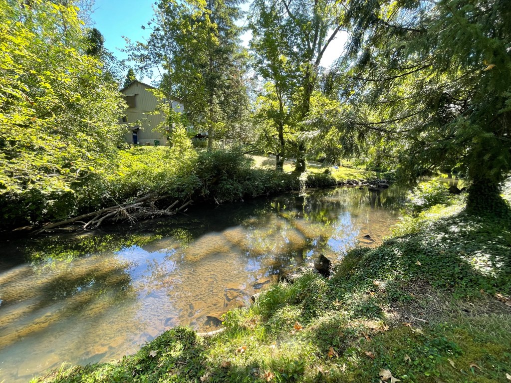 When I was a kid, that area across the creek had large native willows, and they draped over the water. They created a kind of a tunnel, and I tied up my raft in there, with my books, and a radio. (Sometimes, I even had a cat with me.)