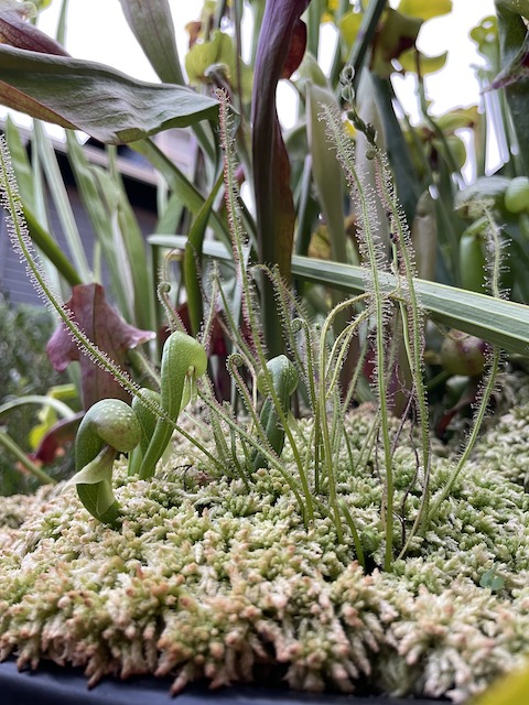 Darlingtonia californica with other hardy carnivorous plants. These plants are in a plant bog planter on the south side of my house.