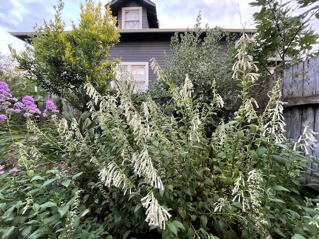 Whatever the name (see above), this Phygelius is a beauty. It’s also planted in the south side garden along with the Nicotiana sylvesteris. It’s my whitecap plant that blooms almost all summer long, and the gondola (hammock) is behind it.