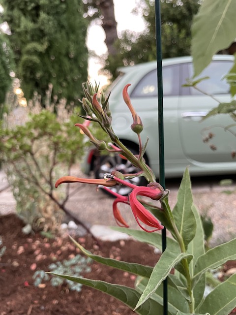 Back in the first days here at this house I ordered seeds for this small shrub. I know now that they are not supposed to be great from seed, and that most are propagated from cuttings, but this one worked out from seed for me. It was great for many years, and then I kind of neglected the front garden, then it was great again, then I neglected it again, but now it is back and it looks great this year. It’s a low water plant but it does better with some regular irrigation. Sadly, this is not the climate for growing pomegranate fruit, so I am not disappointed that I cannot eat lots of its fruit, but this is the climate for growing beautiful ornamental pomegranates so I suggest that you try one if you like them as much as I do. If I had more space, I would plant a larger one. There are several great ornamental cultivars.