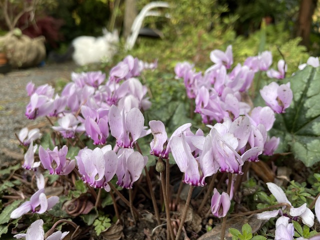 Around here the hardy cyclamens are a tried-and-true go-to for fall blooms. They look to me like flocks of winged magical little creatures falling to the ground. Clustering around the garden in different spots, they’re always welcome and you cannot have enough of them.