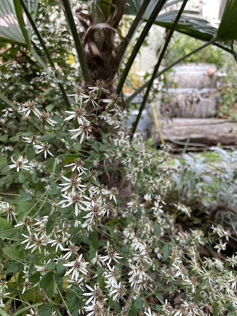 This is a bit of a sloppy perennial but for some reason it looks lovely at the base of my Trachycarpus. It’s a wood aster, Eurybia divaricata.