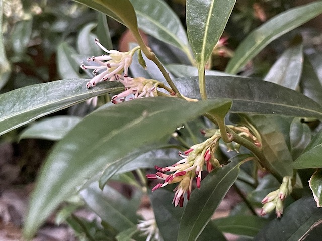 I have a few different ones in the garden. This one is Sarcococca hookeriana var. humilis and it’s in the back garden. Since it’s a lower growing option it works well as a ground cover.