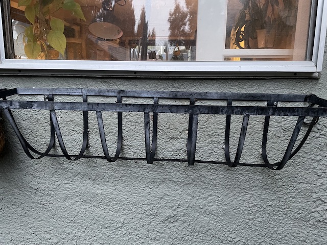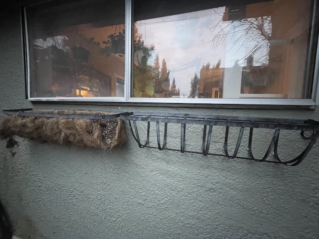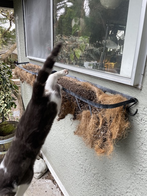 This is Alfie, our youngest cat, and he found a creative way to let me know when he wants to come back into the house. While the other cats either sit at the door, meow, or paw-pound at it loudly, Alfie jumps into my window box planter and stares into the room that’s my office and plant room.