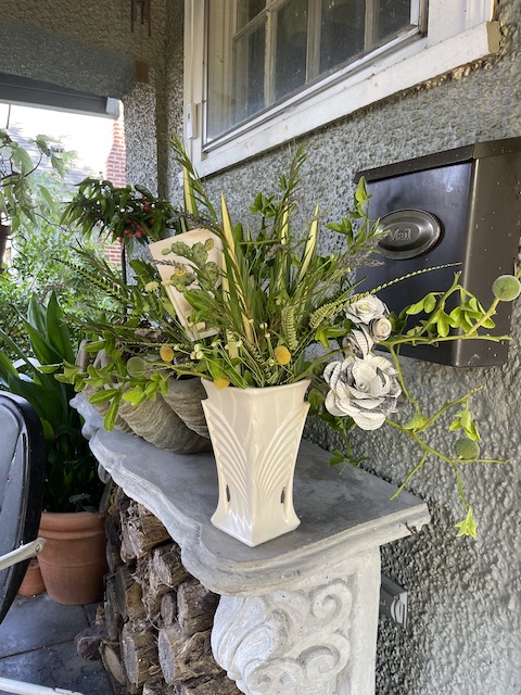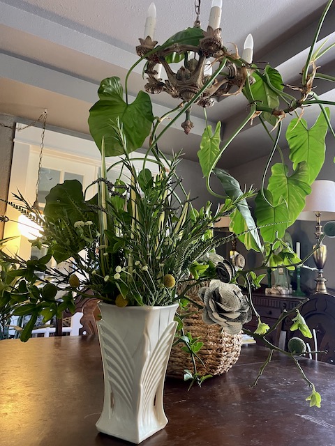 I thanked her again for the vintage book from months ago, and told her I was just starting to write about it, but I was yet in a bit of awe of the vintage vase and arrangement that she’d brought me. It was perfectly thought out, with special plants, and I DO love vintage pottery so, so much. This vintage McCoy will be loved and honored for years to come. It can be my floral trophy.