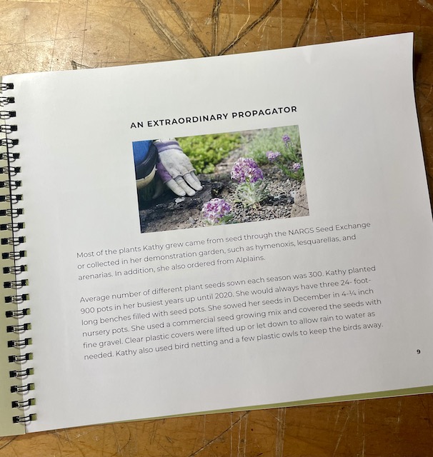 My friend Baldassare knew Kathy for many years, and while Evan and I were there in December, Baldassare made sure to get one of the Siskiyou NARGS chapter’s books about her for me. It was beautifully put together with photos, captions, and quotes from those who knew her well.